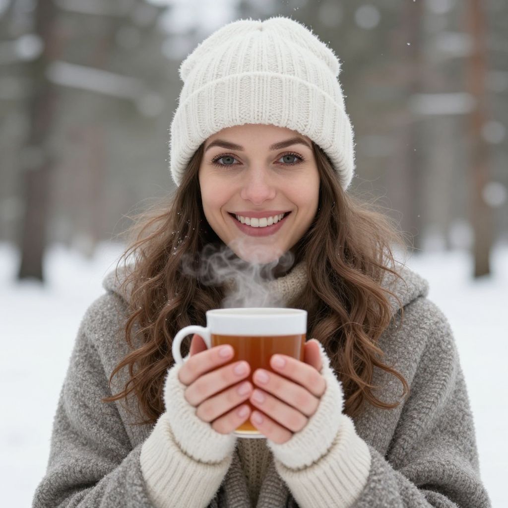 Woman bundled in winter attire smiles warmly while holding a steaming cup of tea, embodying comfort and wellness amidst a snowy forest backdrop.