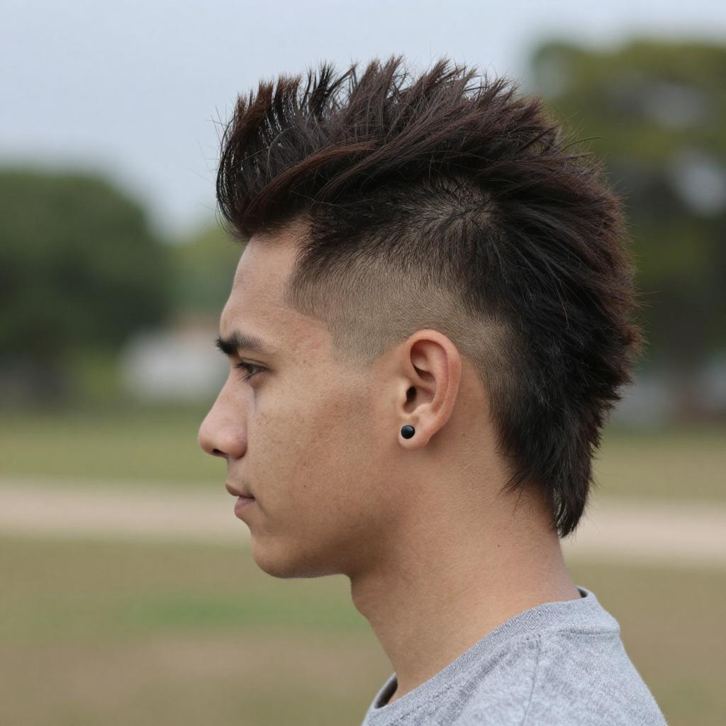 Photograph of a young man in profile, showcasing a dramatic, dark brown mohawk with a high fade on the sides. His skin is light with a few freckles, and he has black ear gauges. He's wearing a grey shirt, and the background is softly blurred with hints of greenery and sky, creating a natural, outdoor setting.