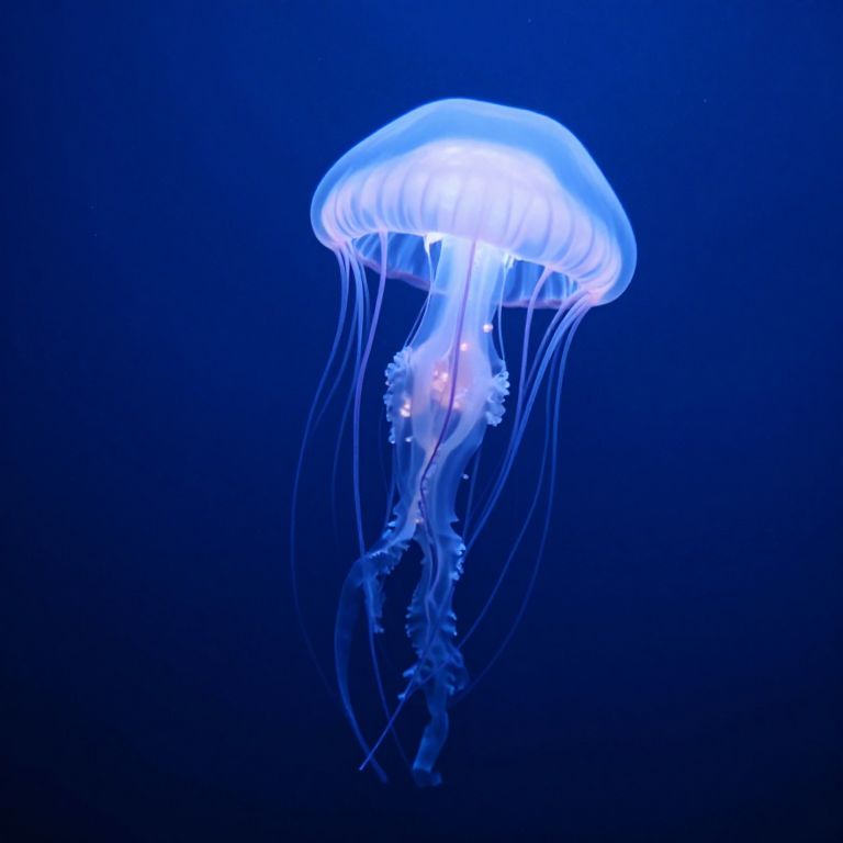 In the depths of a liquid cobalt expanse, a colossal jellyfish drifts serenely, its bioluminescent tendrils weaving ethereal lullabies that cradle dreams and invite introspection, while the faint hum of its rhythmic pulsations echoes the timeless dance of life and mystery.