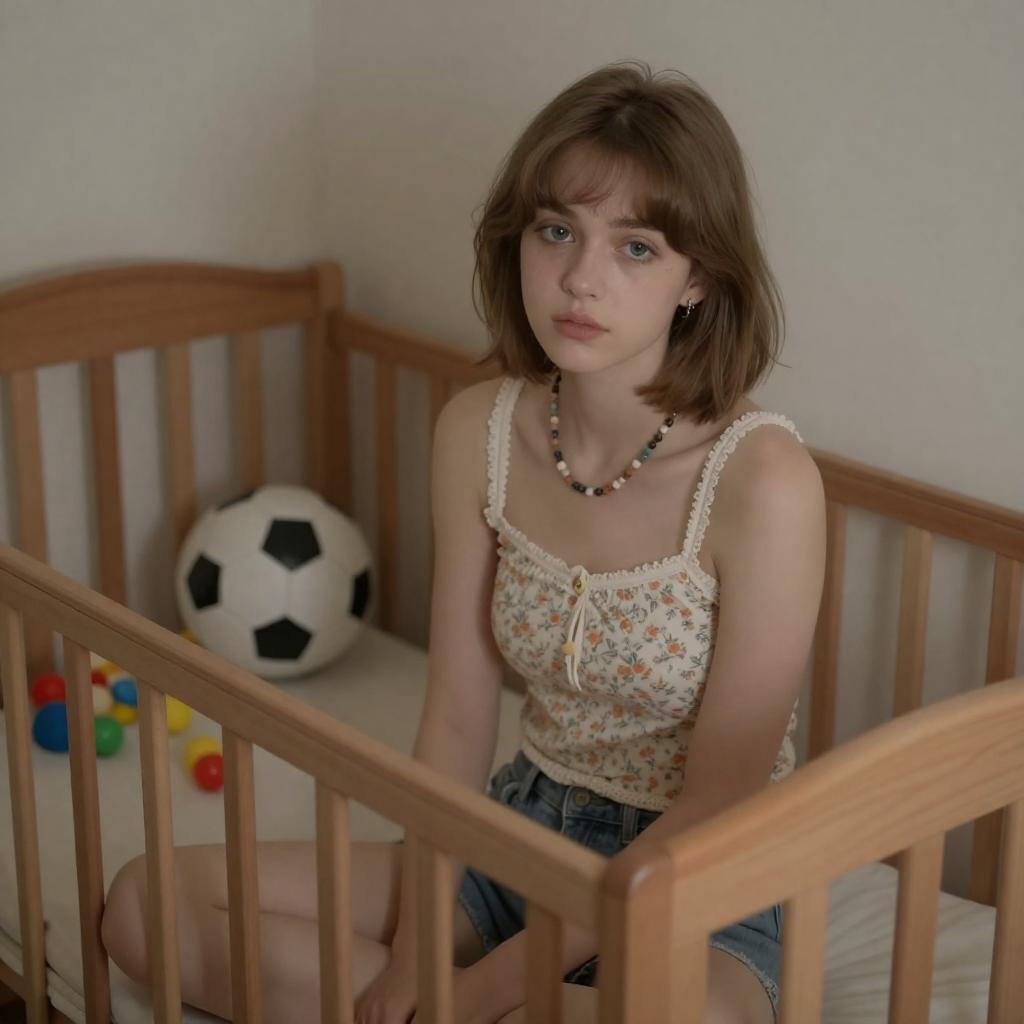 Young woman with light brown bob haircut, wearing a floral tank top and bead necklace, sits in a wooden crib. Dimly lit bedroom with a soccer ball, colorful toy, and beige blanket on the crib mattress. She has a neutral expression. Two wooden crib sides frame her.