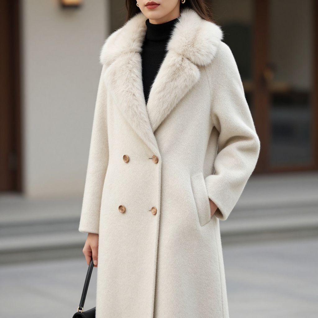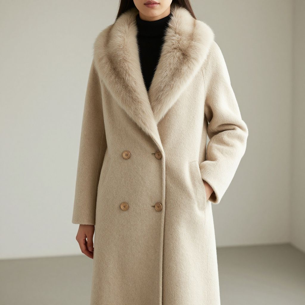 Elegant wool long coat featuring a plush fur collar and double-breasted design, worn by a woman with her hand tucked into the pocket, showcasing its sophisticated and warm winter style.