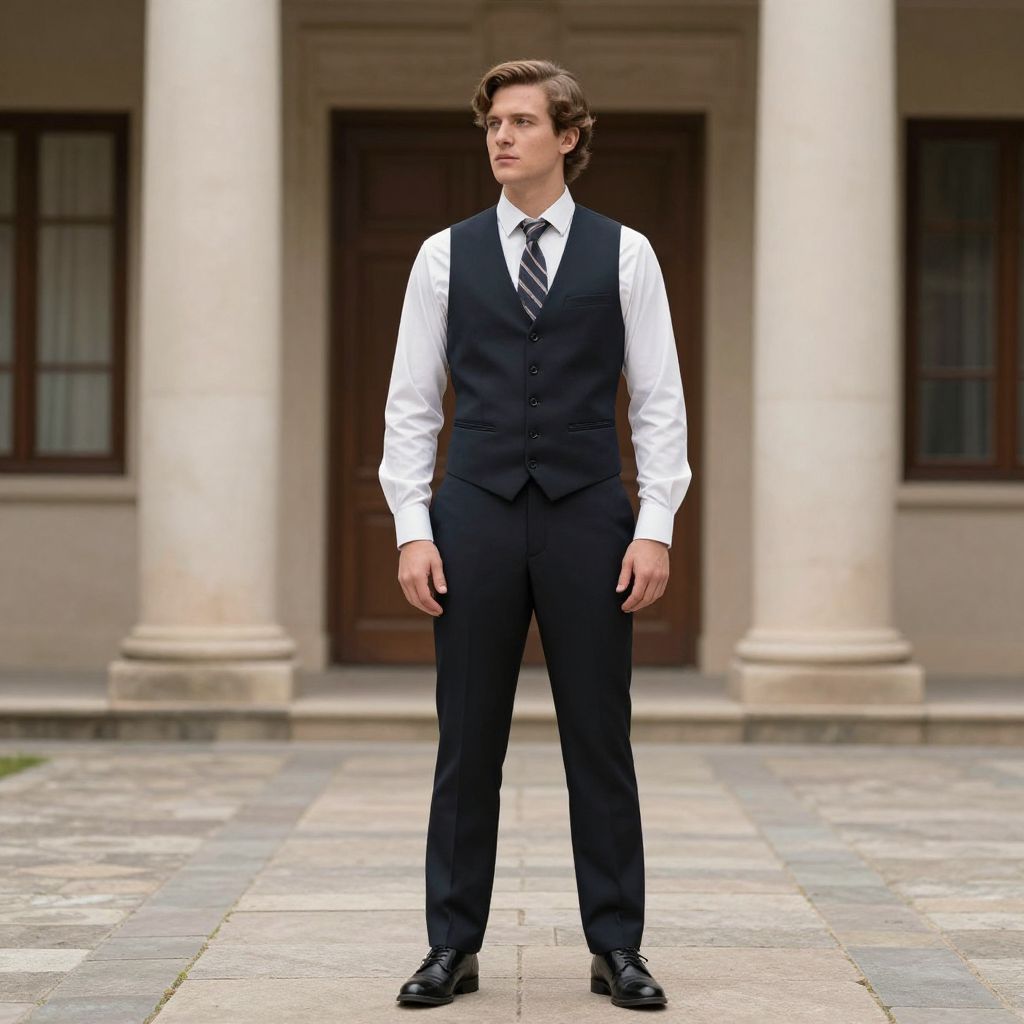 Photograph of a young Caucasian man standing in front of an elegant, classical building with tall columns and a stone-paved courtyard. He has light brown, wavy hair and a serious expression. He is dressed in a formal black vest over a white dress shirt with a black tie, paired with black trousers and polished black dress shoes. The background features a large wooden door and rectangular windows with dark frames. The image has a sharp, high-contrast style, emphasizing the man's formal attire and the architectural details of the building.