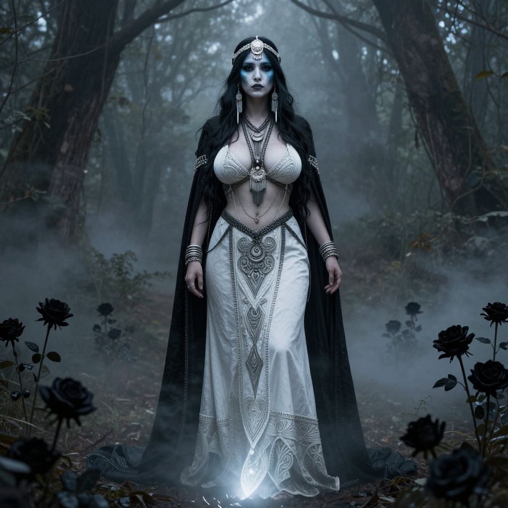 The image depicts a full-body shot of a lost soul spirit ghost, a Native American woman, exuding a sense of femininity with a large chest and wide hips, baring a significant amount of skin. Her attire is intricate and detailed, featuring a combination of white and black elements, with a white dress adorned with elaborate patterns and a black cloak. The woman's hair is long and dark, cascading down her back, and she is adorned with a headpiece and various accessories, including a necklace and bracelets. Her face is painted with white and blue hues, adding to the ghostly and ethereal quality of her appearance. The background is a misty, foggy forest, filled with black roses and a sense of haunting, with a dramatic light source illuminating the scene from the bottom, creating volumetric lighting effects. The overall composition is intricate and detailed, with a sense of depth and spatial relationships, capturing the essence of a forgotten realm.