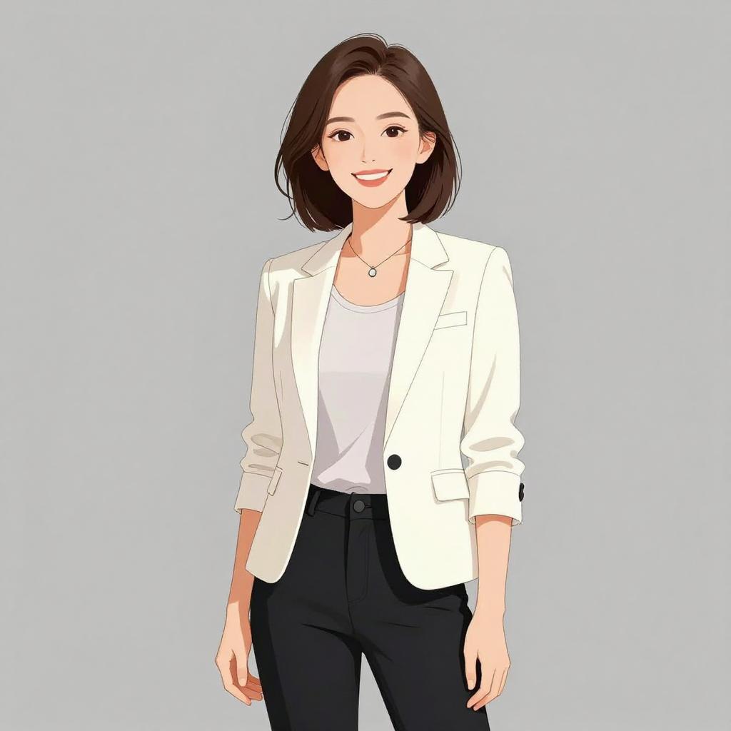 Woman with pretty face and pretty hair. smiling Woman, classic, black tailored blazer with clean lines and zip pockets, white v-neck loose-fitting blouse, cream tapered trousers, waistband, minimal accessories, structured envelope clutch with black and white stripes, natural makeup, soft waves hairstyle. --sref 1467