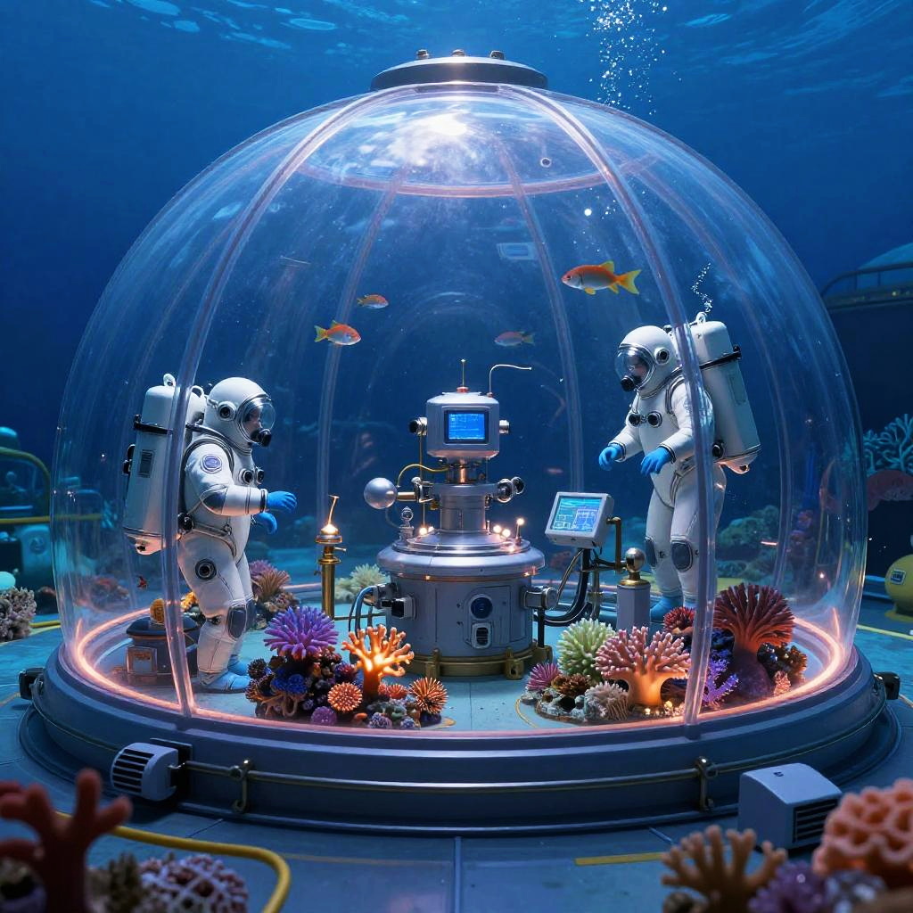 Nobios-themed underwater research station, transparent dome with vibrant marine life outside, scientists in state-of-the-art diving suits, glowing coral reefs, advanced scientific equipment emitting gentle light, serene and immersive aquatic atmosphere