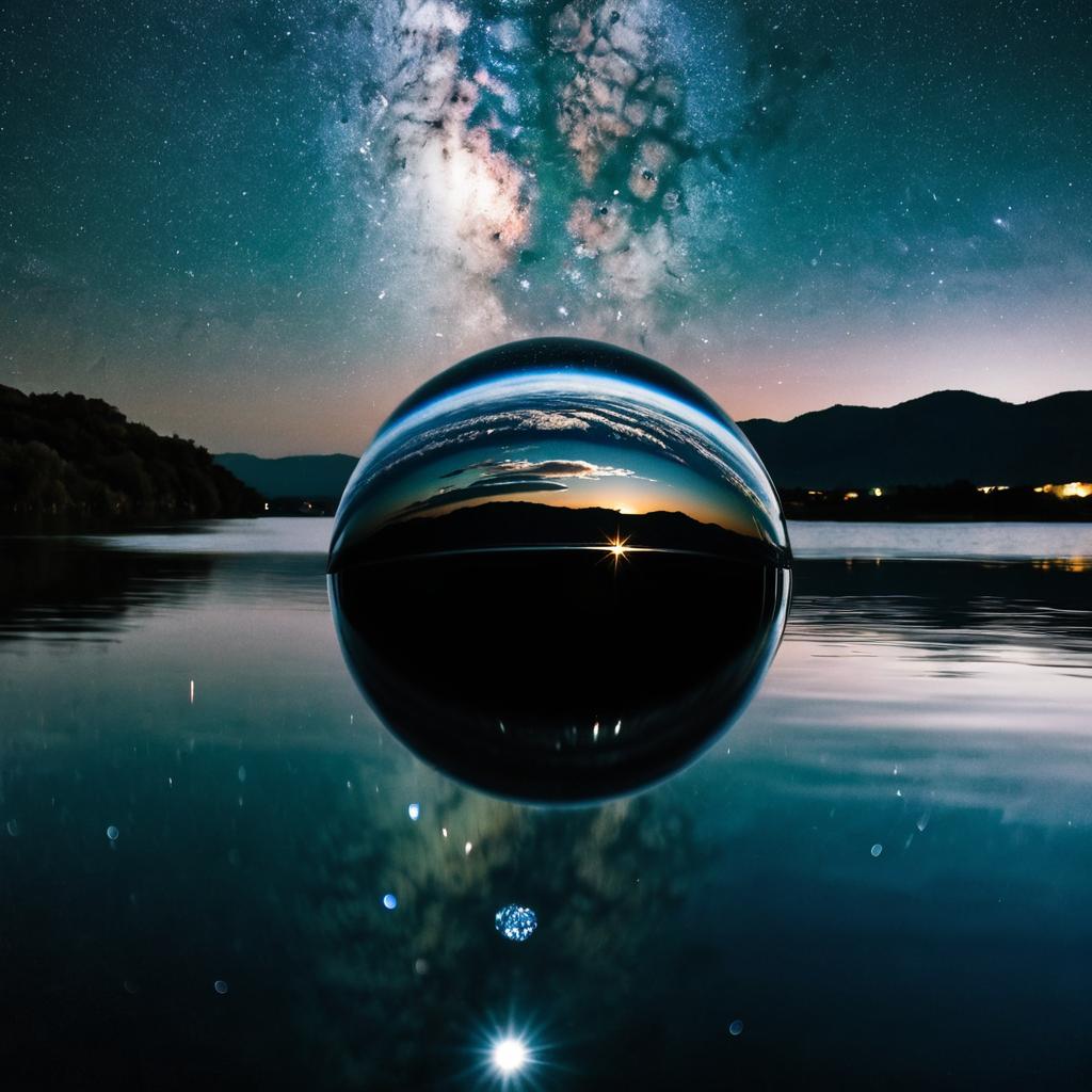 No humans, reflection, night, star (sky), sky, traditional media, dark, solo, water, ripples, outdoors, night sky, eye focus, space