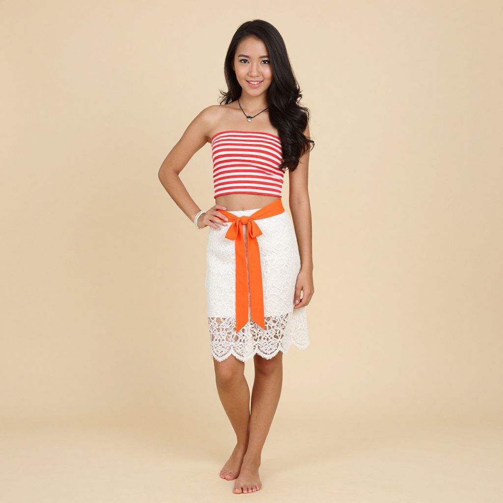 Photograph of a young Asian woman with long, wavy black hair standing against a plain beige background. She's wearing a red and white striped, strapless crop top and a white lace, knee-length skirt with a bright orange sash tied at the front. She has a confident smile, a black necklace, and a white bracelet on her right wrist. She's barefoot and standing with one hand on her hip.