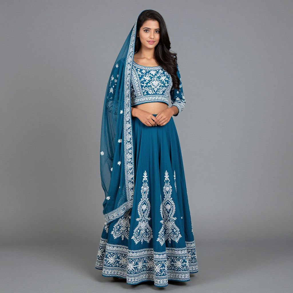 Photograph of a South Asian woman with long, wavy black hair, standing against a plain gray background. She wears a traditional blue lehenga with intricate white embroidery on the blouse and skirt, and a matching sheer blue dupatta with white patterns. Her complexion is medium brown, and she has a calm, confident expression. Her hands are gently clasped at her waist. The lehenga's skirt is long and flowing, adorned with elaborate floral and geometric patterns. The overall style is elegant and traditional, highlighting the rich cultural attire.