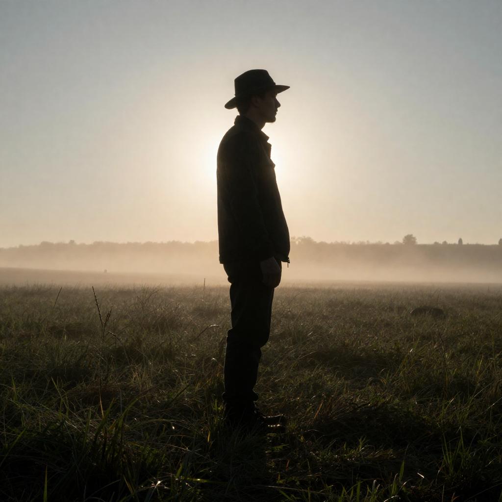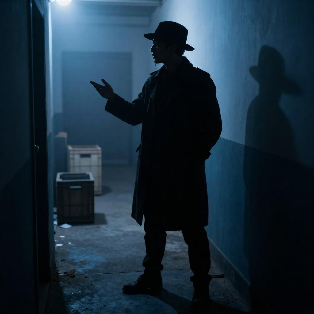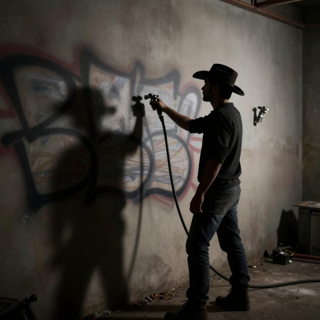 Silhouetted man with cowboy hat spray-painting dark graffiti on a ured wall. He holds a curved spray nozzle in his right hand. Shadows cast by his figure and wall dominate the dimly lit room. Another spray nozzle is attached to the wall. Grungy, industrial setting with scattered equipment. Intense lighting highlights the wall's ure.