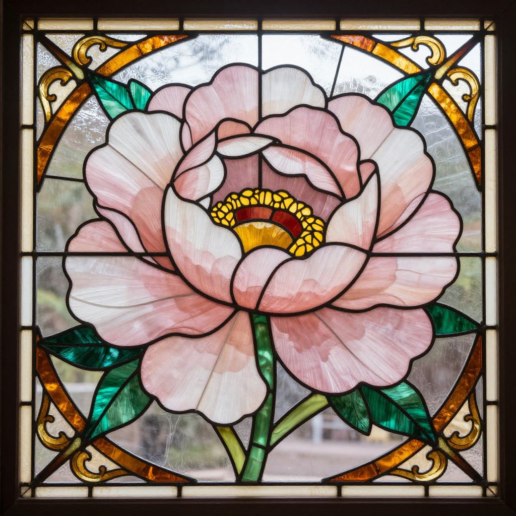 Elegant stained glass peony design with layered glass panels in pastel pinks and whites, surrounded by swirling decorative patterns in emerald and amber hues, light shining through creating vibrant reflections, a blend of classic and modern styles