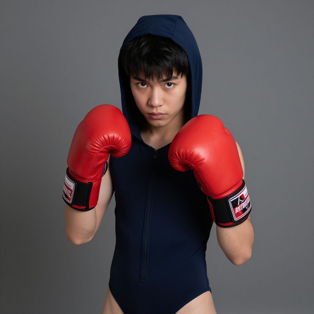 Boy with short black hair, wearing a red boxing outfit with white trim and red boxing gloves.