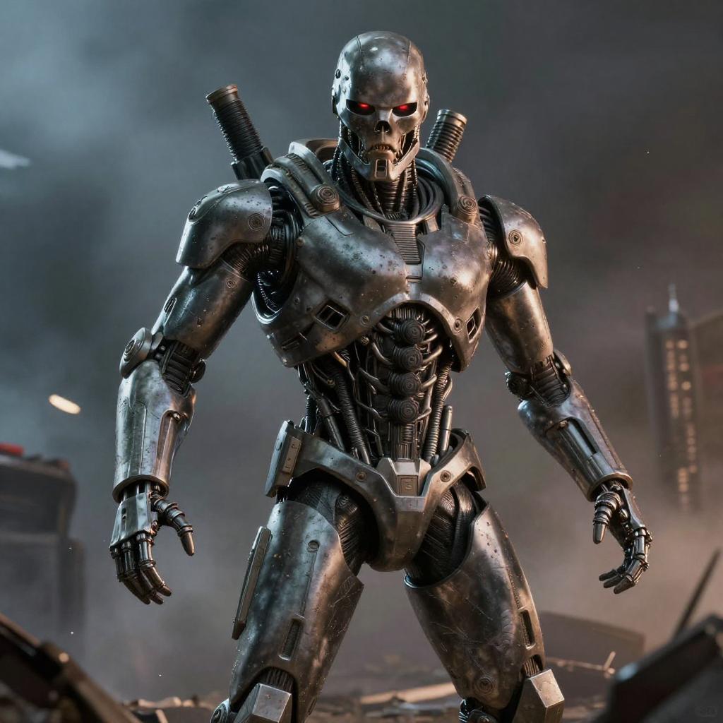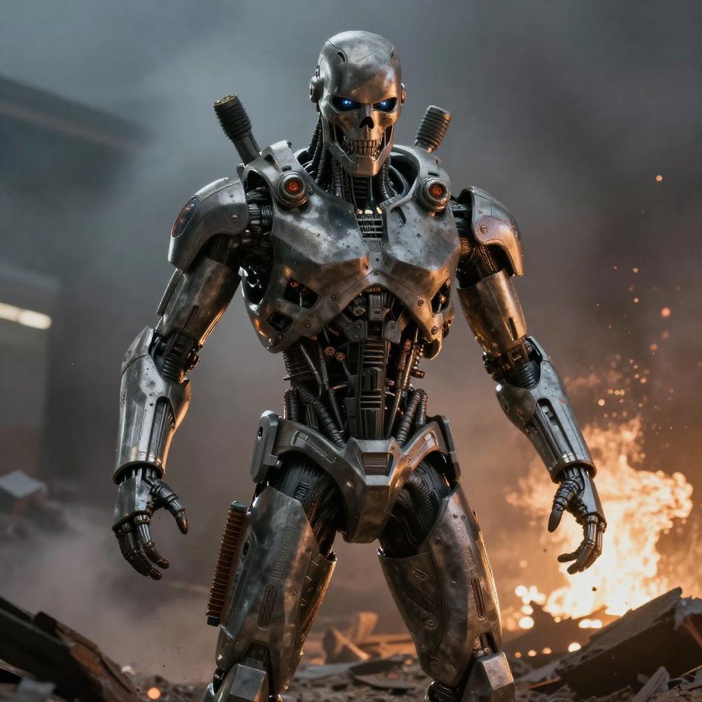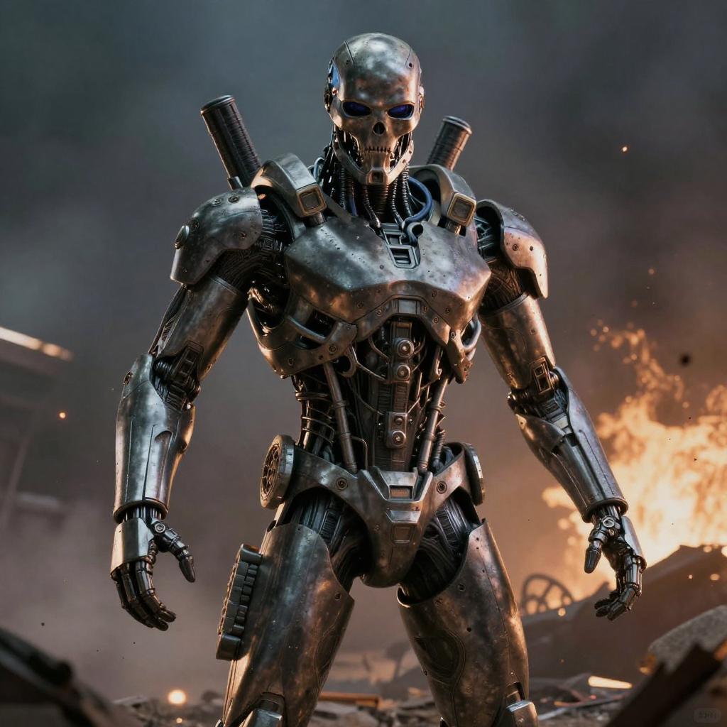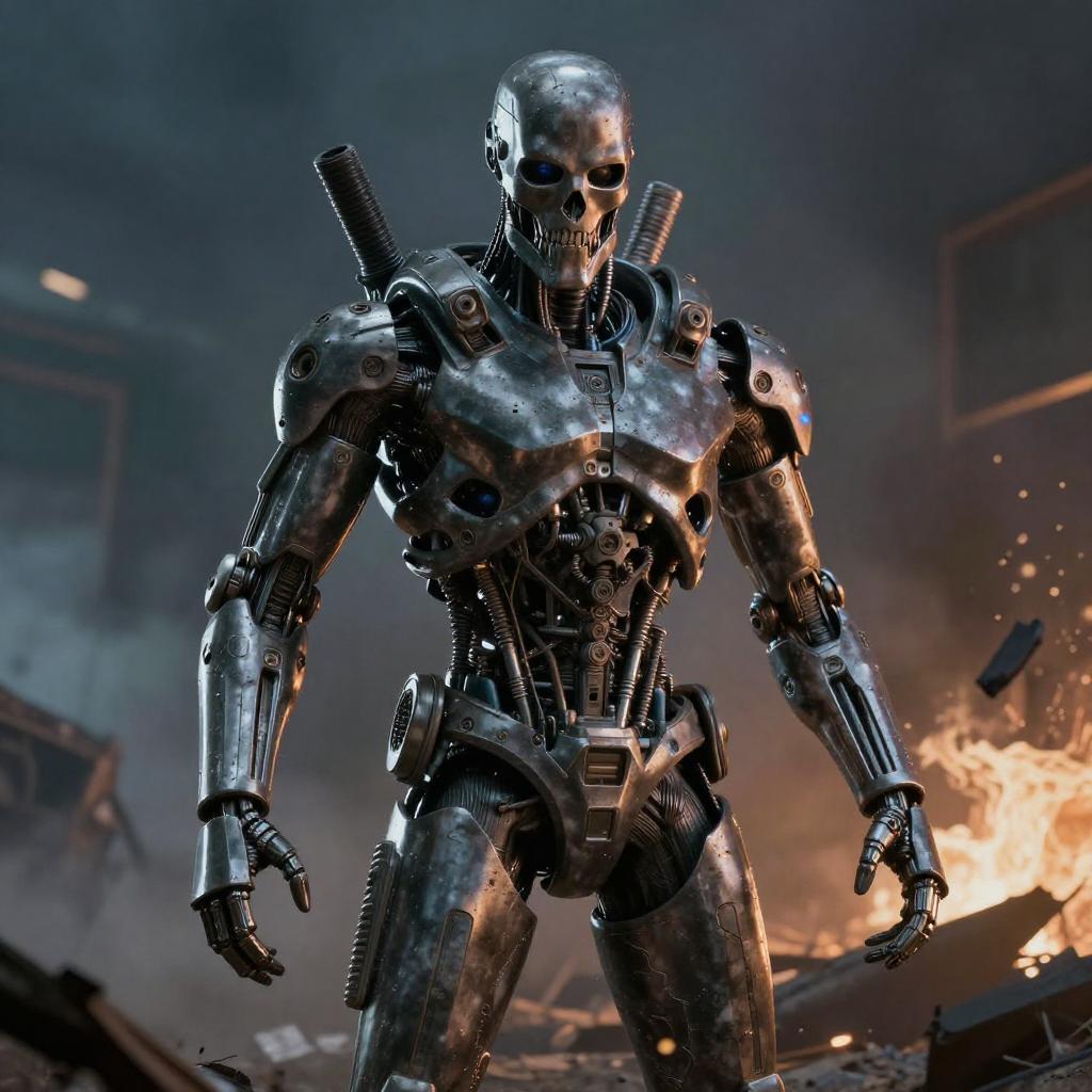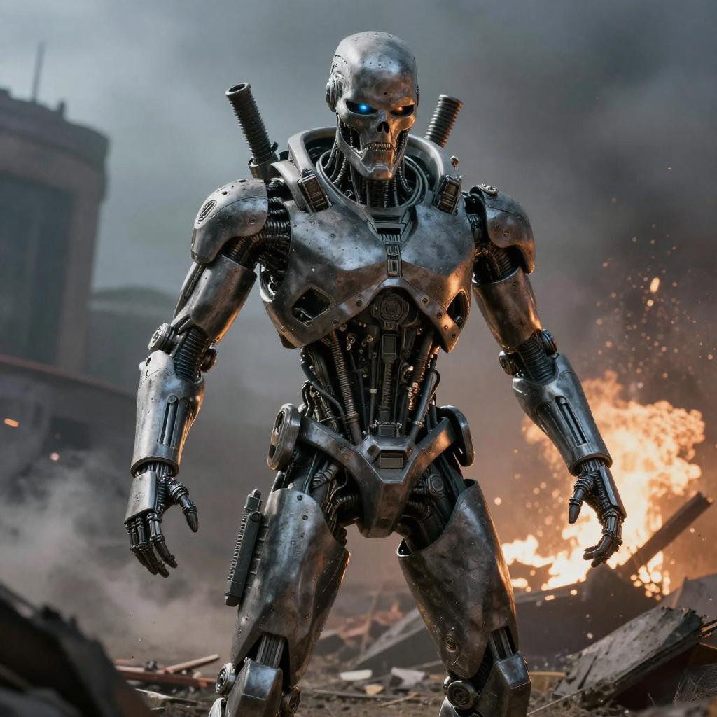Syberart, centered, create a dramatic and action-packed terminator. Use advanced photography and image editing techniques to realistically capture intense expression and posture, and play with light and shadow to add depth and drama to the image. Incorporate elements of the battlefield, such as debris and destruction, to add context and visual interest to the image. Make sure the image has high resolution and impeccable image quality to ensure a very realistic and dynamic appearance