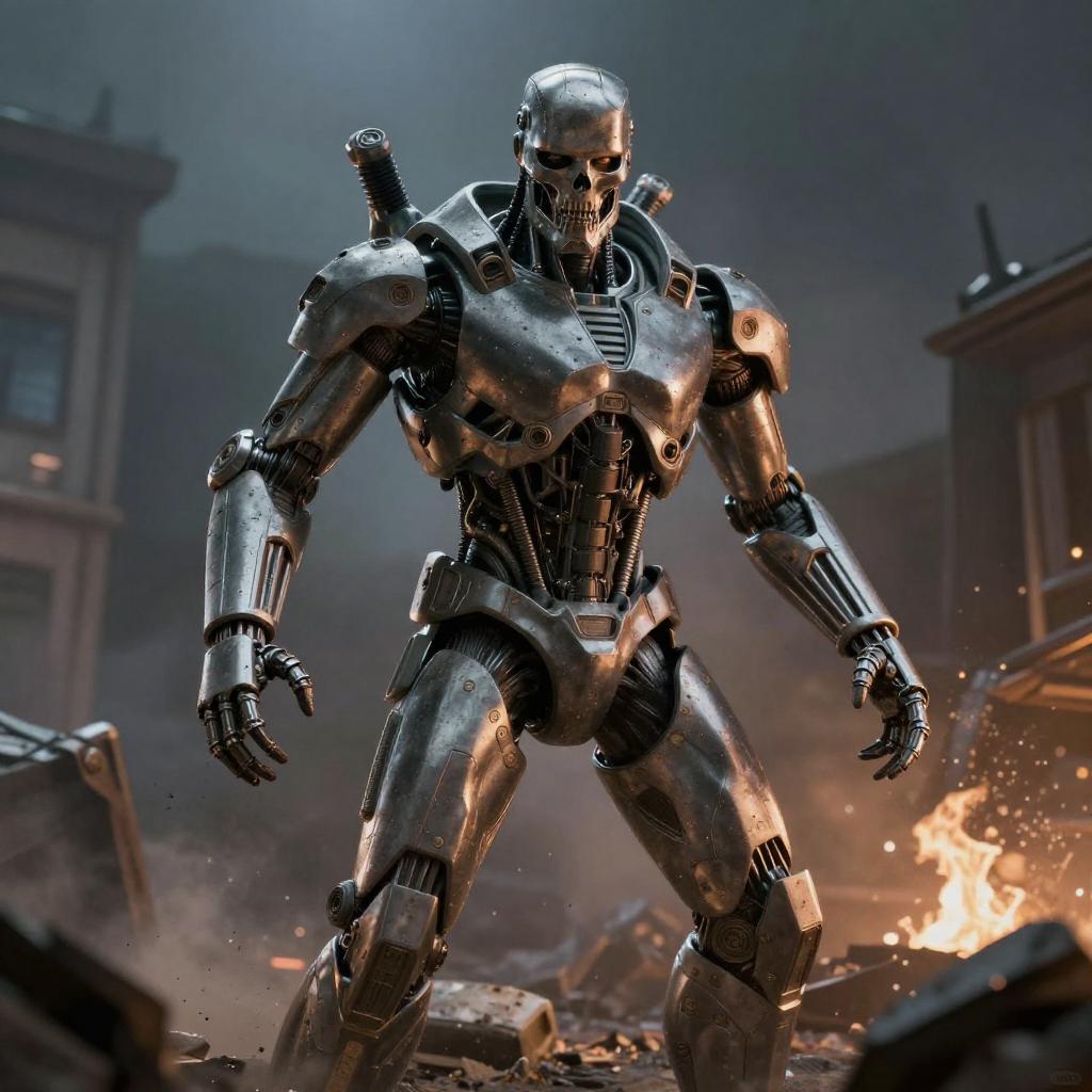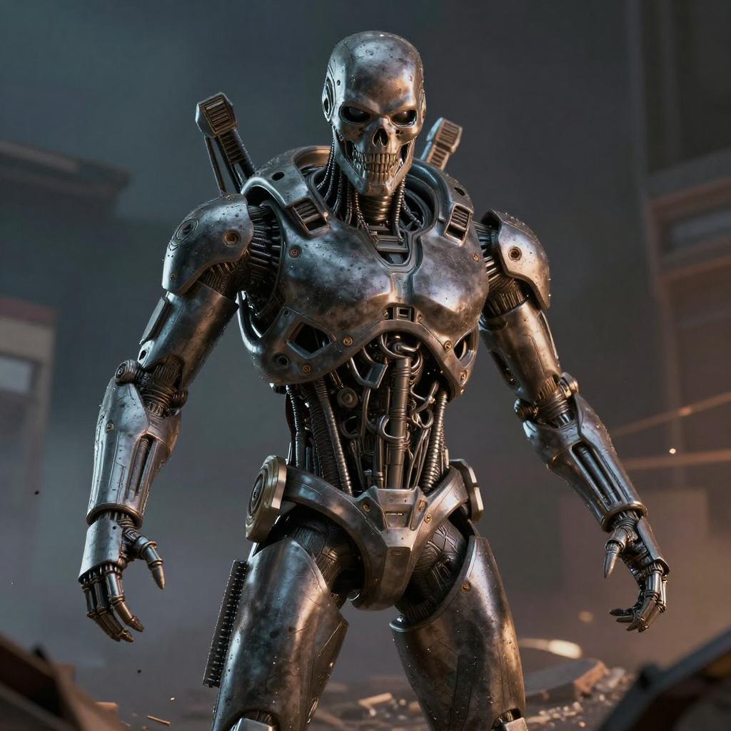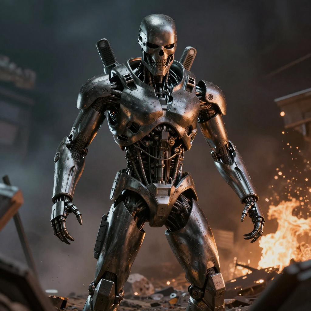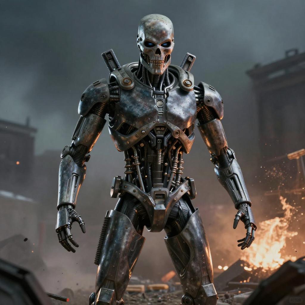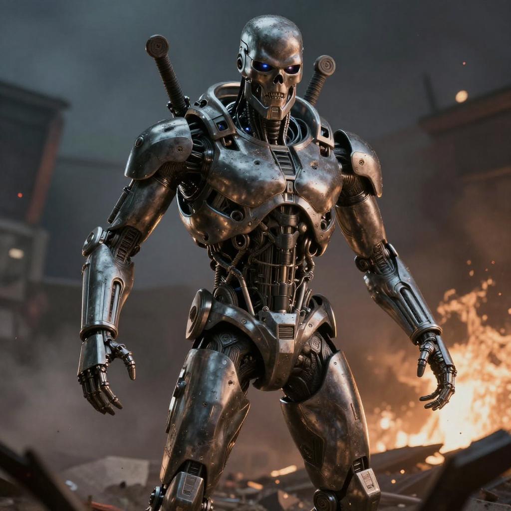Syberart, centered, create a dramatic and action-packed terminator. Use advanced photography and image editing techniques to realistically capture intense expression and posture, and play with light and shadow to add depth and drama to the image. Incorporate elements of the battlefield, such as debris and destruction, to add context and visual interest to the image. Make sure the image has high resolution and impeccable image quality to ensure a very realistic and dynamic appearance