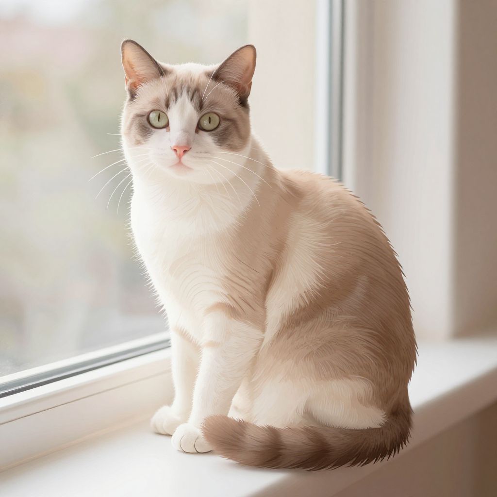 Turning photos into drawings, digital stylized drawing of an elegant cat sitting on a windowsill, smooth flowing lines, subtle pastels and soft gradients, cozy indoor environment, focus on fur texture and gentle light play