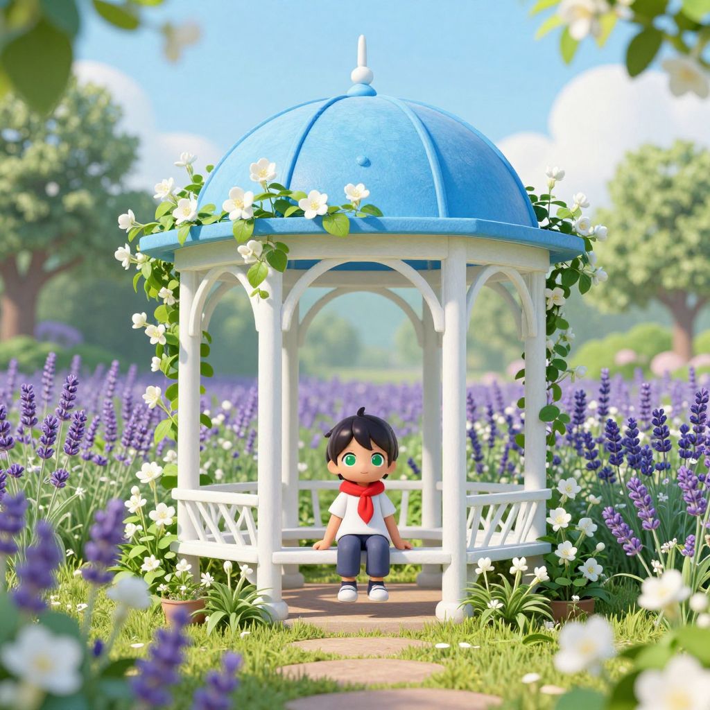 A vibrant digital illustration features a cute, chibi-style boy with black hair and green eyes, wearing a white shirt, red scarf, and blue pants, sitting on a white, ornate, blue-domed gazebo. The gazebo is adorned with white flowers and green vines. The background shows a lush garden filled with purple lavender and white flowers under a bright blue sky. Sunlight filters through green trees, creating a serene, whimsical atmosphere. The boy's expression is cheerful, and the overall scene is colorful and lively.