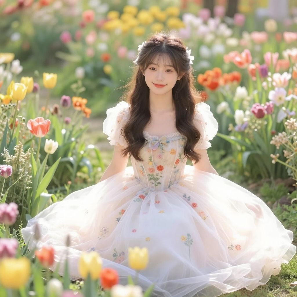 Victorian bridesmaid dresses with corseted bodices, lace gloves, and floral headpieces, surrounded by blooming roses in a manicured garden, dreamy and classic visual style