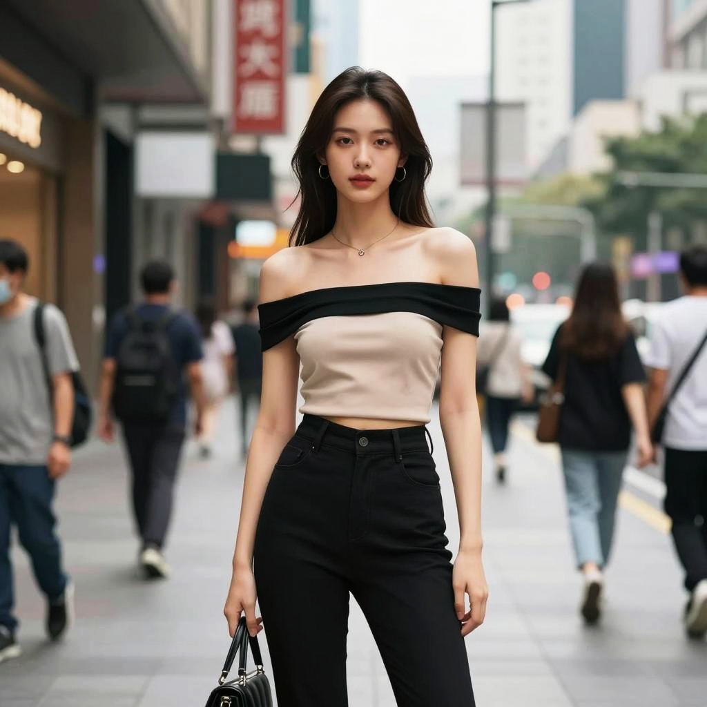 A confident young woman stands at the entrance of a bustling urban environment, showcasing modern city life. She wears a stylish off-the-shoulder top paired with high-waisted pants, exuding a sense of contemporary fashion and individuality amid the vibrant street backdrop.