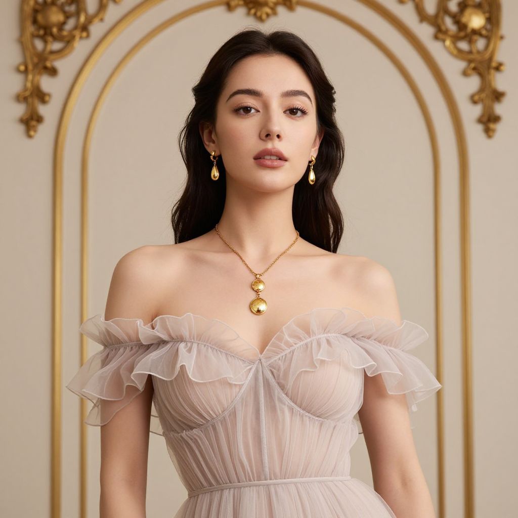 Elegant portrait captures a woman adorned in a delicate off-the-shoulder gown with ruffled details, complemented by a gold necklace featuring two pendants and matching earrings, set against a classic arched frame with ornate golden embellishments.