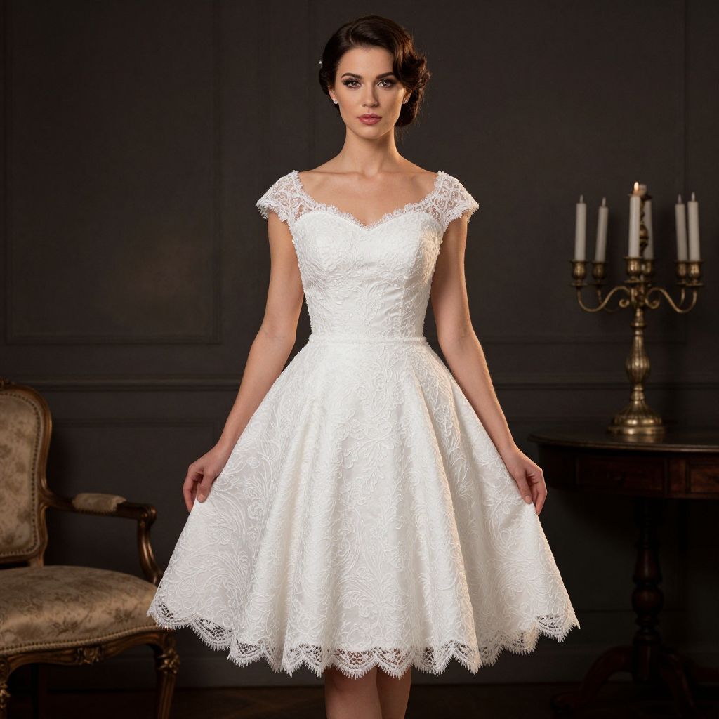 A woman elegantly poses in a high-definition, vintage-inspired white short wedding dress featuring intricate lace detailing and a flared A-line silhouette, complemented by dramatic lighting and classic bridal accessories.