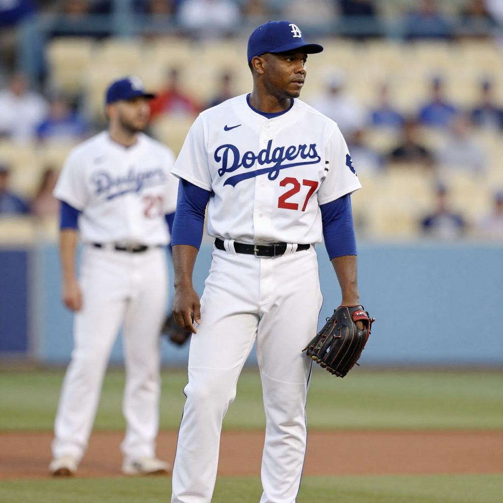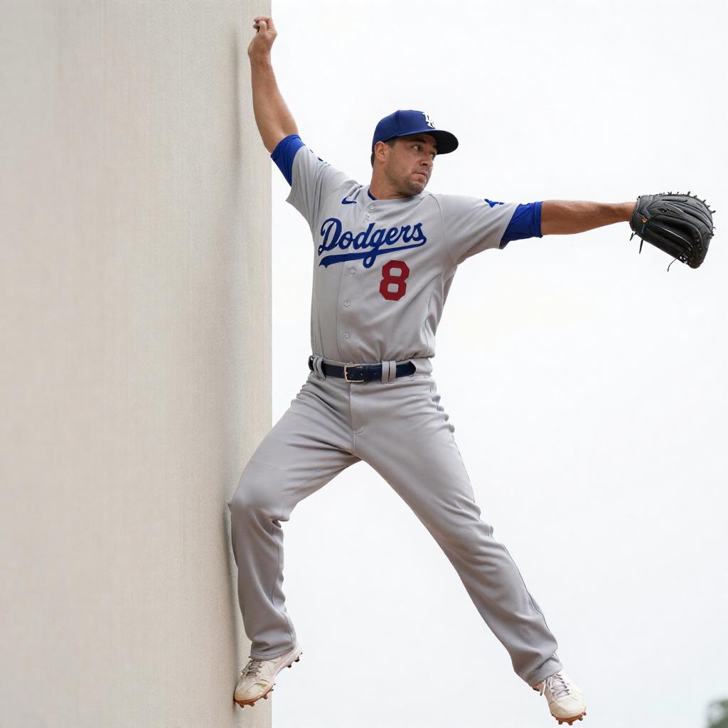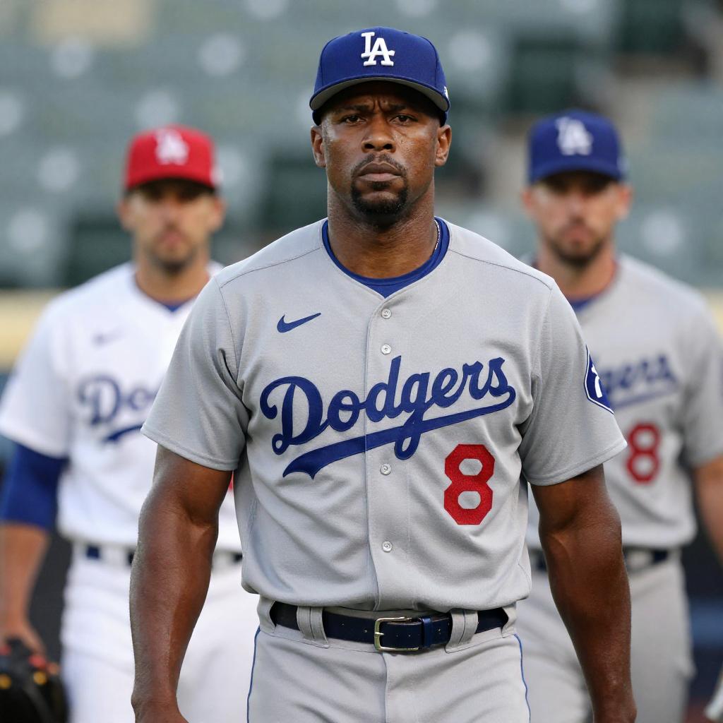 Photograph of two men standing on a baseball field. The man on the left wears a Dodgers jersey with "55" and a baseball cap, blowing a bubble with gum, smiling. The man on the right, in a blue jacket and matching Dodgers cap, points at the other man, wearing glasses, with a serious expression. Background includes a crowded stadium, scoreboard, and city skyline. Both men have medium brown skin and short dark hair.