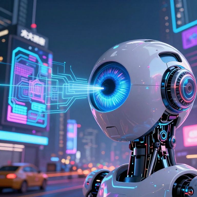 Picture based AI visualized as an advanced robotic eye scanning a dynamic cityscape filled with digital billboards and augmented reality elements, cyberpunk aesthetic with neon tones, intricate textures representing intelligent image recognition algorithms in action.