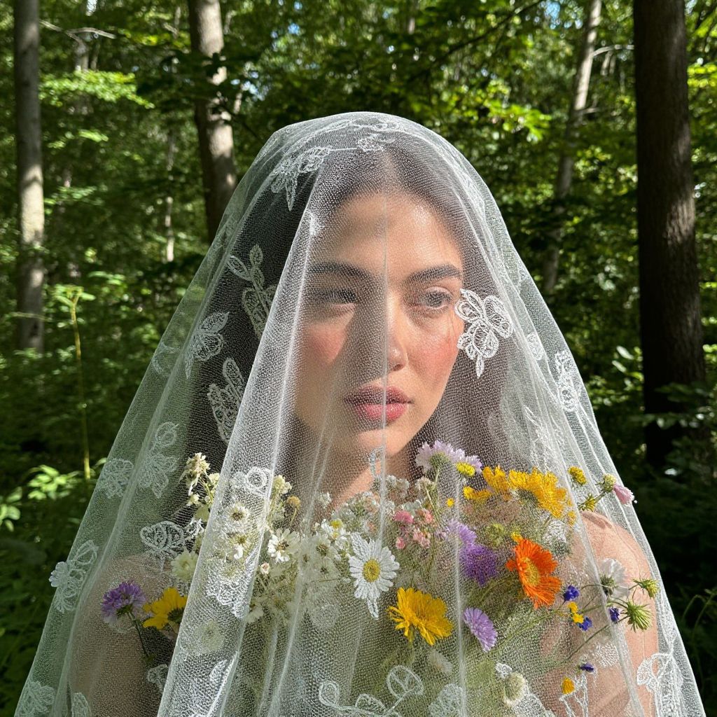 A captivating woman, her face partially obscured by an ethereal veil with delicate lace-like patterns, is captured in this photorealistic portrait. Vibrant wildflowers artfully adorn the veil, mirroring her facial contours and adding intricate detail to the image. Behind her, a lush sunlit forest stretches out in vivid greens, contrasting sharply with the soft hues of the flowers. As sunlight filters through the trees, it casts dappled shadows across her face, emphasizing both the delicate beauty of the veil and the strength of her features. Her introspective gaze seems to peer into another realm, inviting viewers to ponder the mysteries hidden behind this captivating moment.