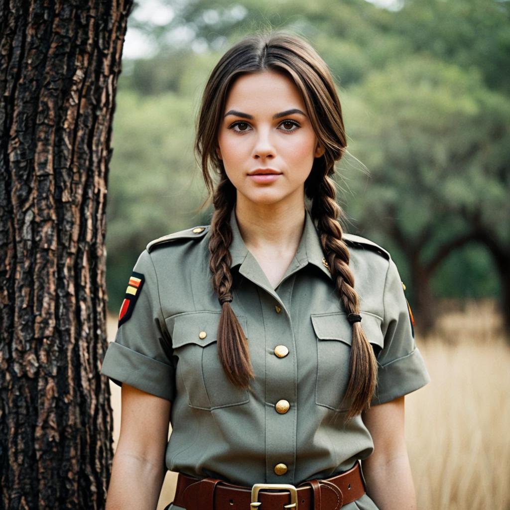 Safari attire woman costume,1girl, realistic, brown hair, belt, brown eyes, solo, long hair, blurry, tree, looking at viewer, outdoors, uniform, blurry background, military, braid
