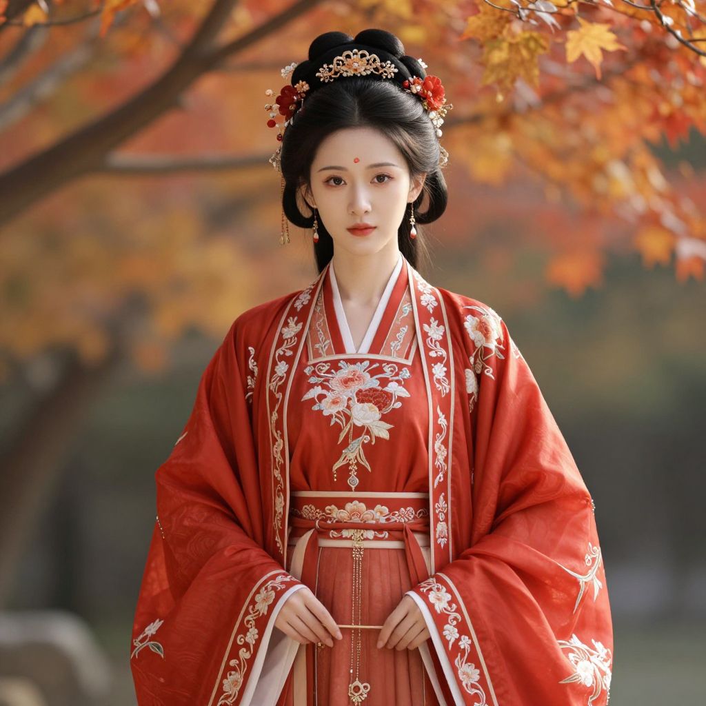 A beautifully rendered digital artwork depicts a woman adorned in an elegant ancient Chinese Hanfu costume, featuring a vibrant red ruqun with intricate floral embroidery, complemented by a matching belt and floral hair accessories, evoking the essence of autumnal fairy elegance in a high-definition, cinematic style.
