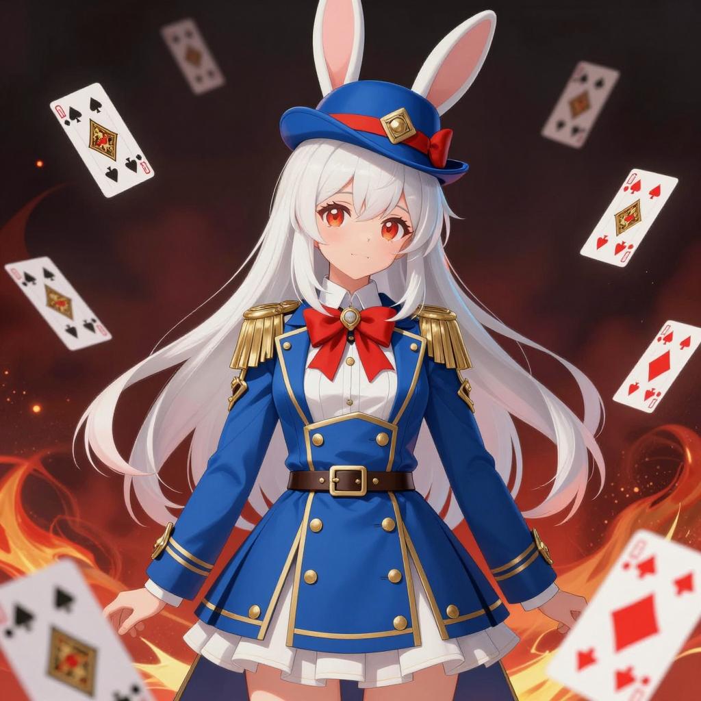 A detailed anime-style illustration of a young girl with long white hair wearing a blue military-themed outfit with gold accents and a matching blue hat. She has rabbit ears and a red bow tie, surrounded by floating playing cards with a fiery red and black background.