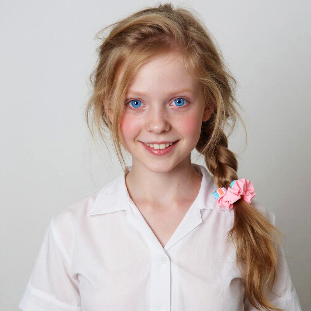 Photograph of a young Caucasian girl with fair skin and bright blue eyes. She has long, light brown hair styled in a loose side braid adorned with a pink flower. She is smiling with slightly rosy cheeks and visible freckles. She wears a white, button-up shirt. The background is a plain, light gray, which makes her stand out. The image is brightly lit, highlighting her features and giving a clean, crisp appearance. The overall style is simple and focused on her expressive face and cheerful demeanor.