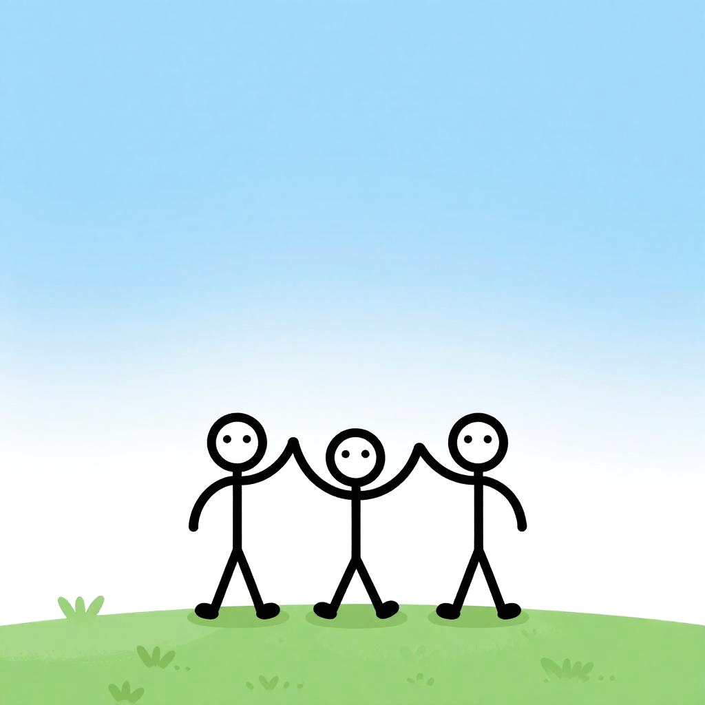 Keith Haring stick figure holding hands with whimsical creatures, outlined in thick black strokes, bright red and yellow accents, joyful and expressive scene with a lively city backdrop