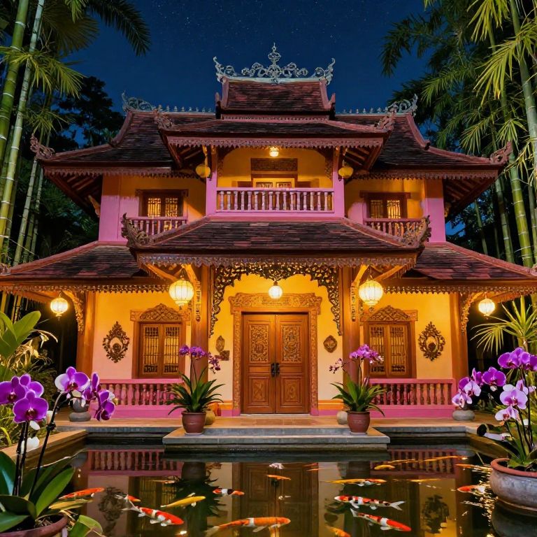 Photograph of a vibrant, ornate Asian-style house at night, illuminated by warm lights, with a reflecting pond, purple orchids, and k