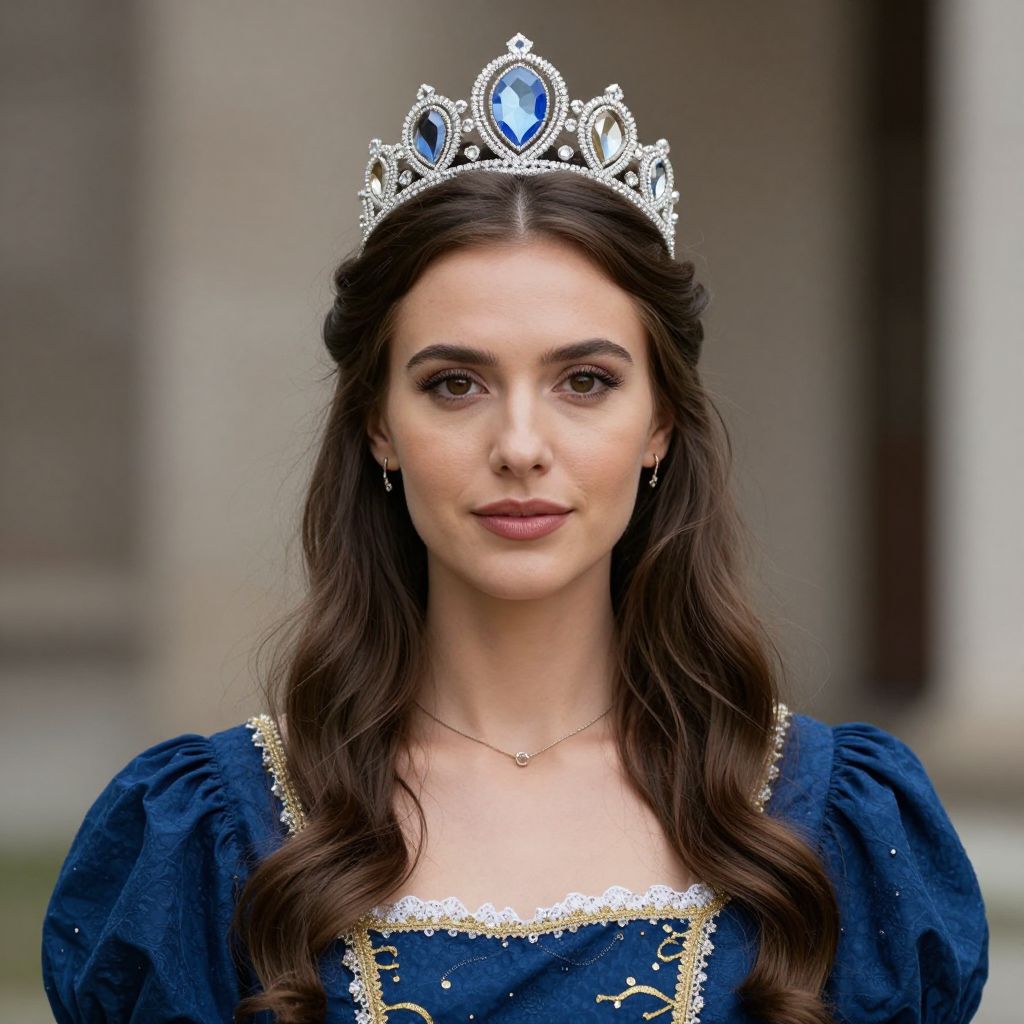 Photograph of a young woman with fair skin and long, wavy brown hair, wearing a delicate silver tiara adorned with a central blue gem. She has dark, well-defined eyebrows and subtle makeup with pink lipstick. She is dressed in a royal blue velvet gown with puffed sleeves and gold trim. She wears small, delicate gold earrings and a simple gold necklace. The background is blurred, suggesting an outdoor setting with stone architecture. The overall style is regal and elegant, evoking a fairy tale princess. The lighting is natural, highlighting her serene expression and the intricate details of her attire.