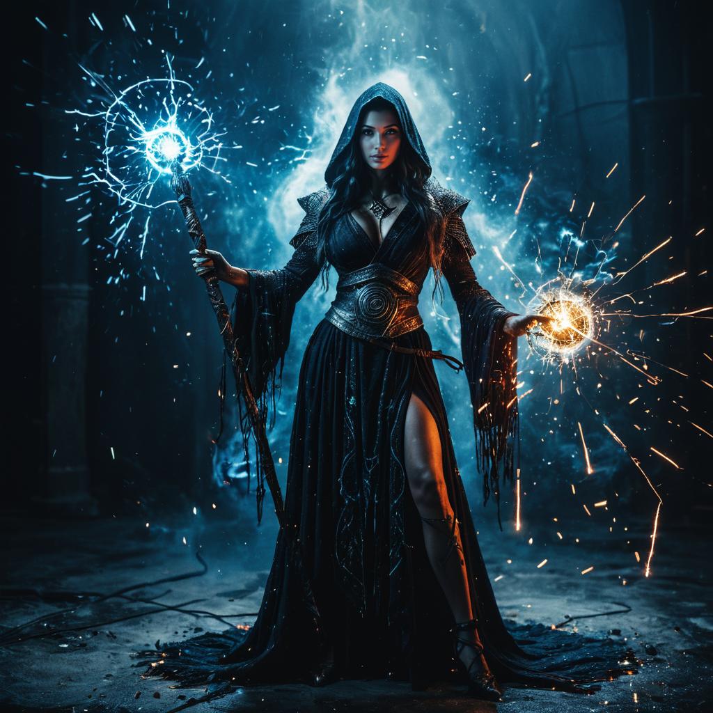 A surreal depiction of a young female sorceress standing on rocky terrain at night, wearing deep teal glowing rune-etched robes with a hood. She holds mystical glowing lanterns in both hands, with an ancient, dark island fortress rising in the misty background. The scene is illuminated with cinematic turquoise lighting, enhanced by glowing magical symbols floating above her head, blending fantasy and mystery in high resolution detail.