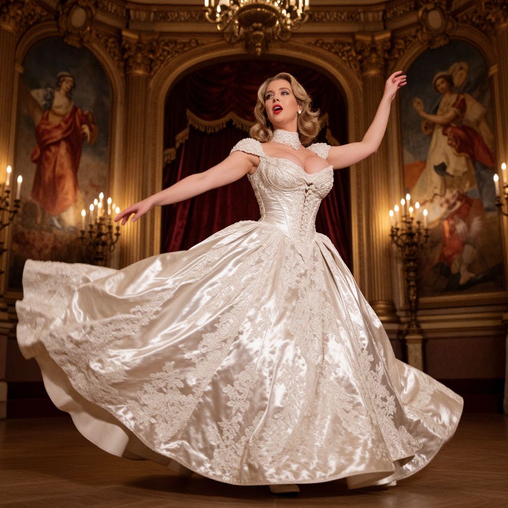 A mesmerizing woman with soft golden blonde hair and a statuesque presence, in a luxurious opera singer diva costume — a voluminous, silk-and-satin dramatic gown with ornate lace, flowing train, and a high neckline that accentuates her neck and décolletage, performing mid-sweep during a gala at an opulent, candle-lit opera theater with velvet curtains and classical frescoes on the walls.. The woman has big tits and cute face