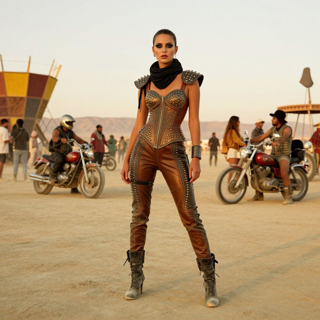 Photograph of a confident woman in a brown, studded leather corset and pants, black scarf, and boots, standing in a desert festival with