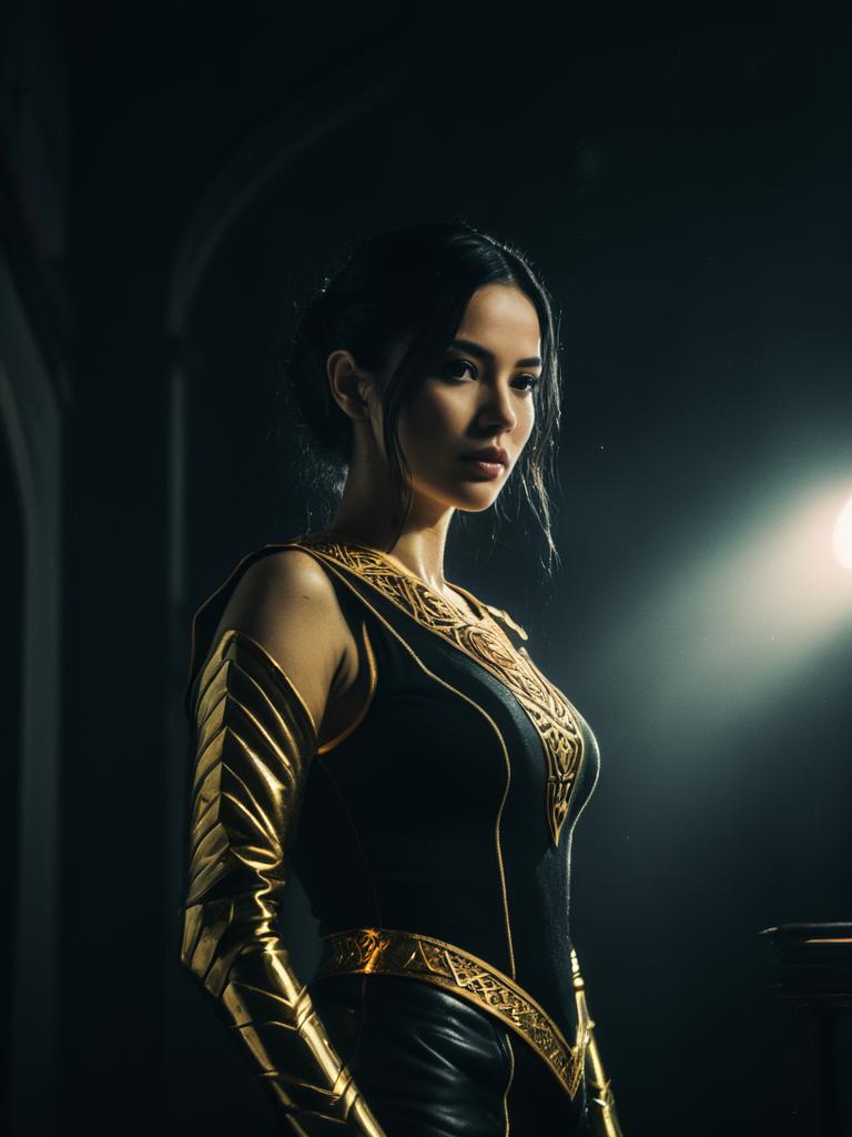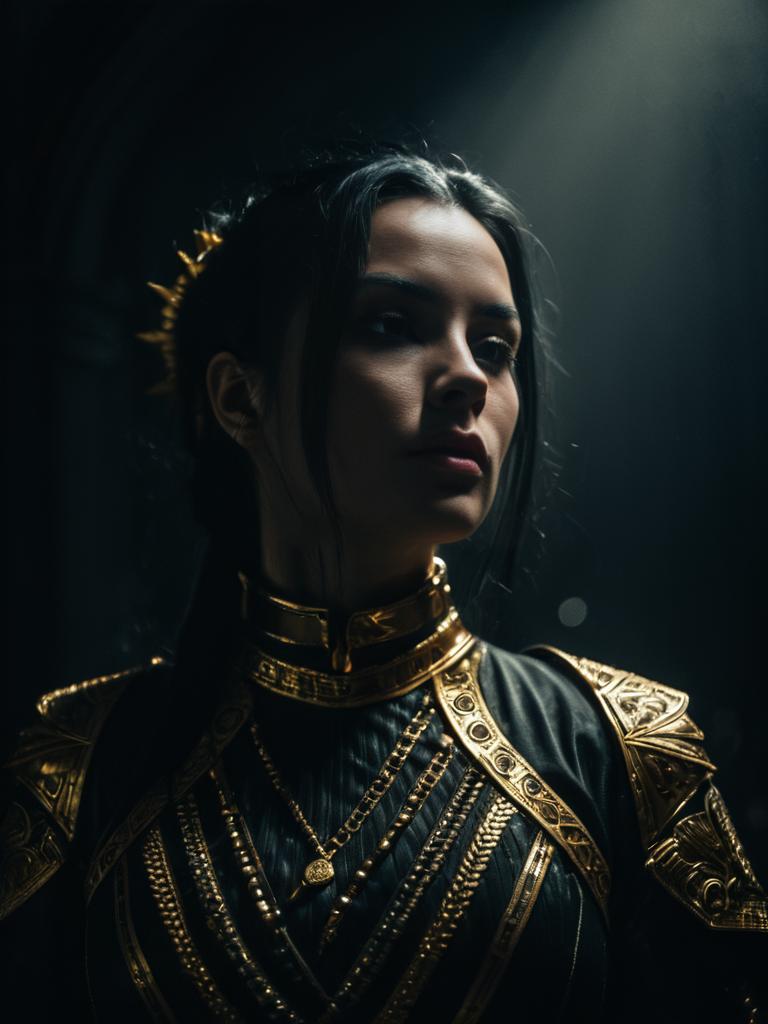 Portrait of a young woman wearing a detailed Aura Bella Fiora cosplay costume featuring black and gold armor with intricate designs. The character outfit includes decorative shoulder armor and a fitted bodysuit with gold accents. The woman has dark hair styled up and a focused expression. The image is shot with dramatic lighting against a dark background.