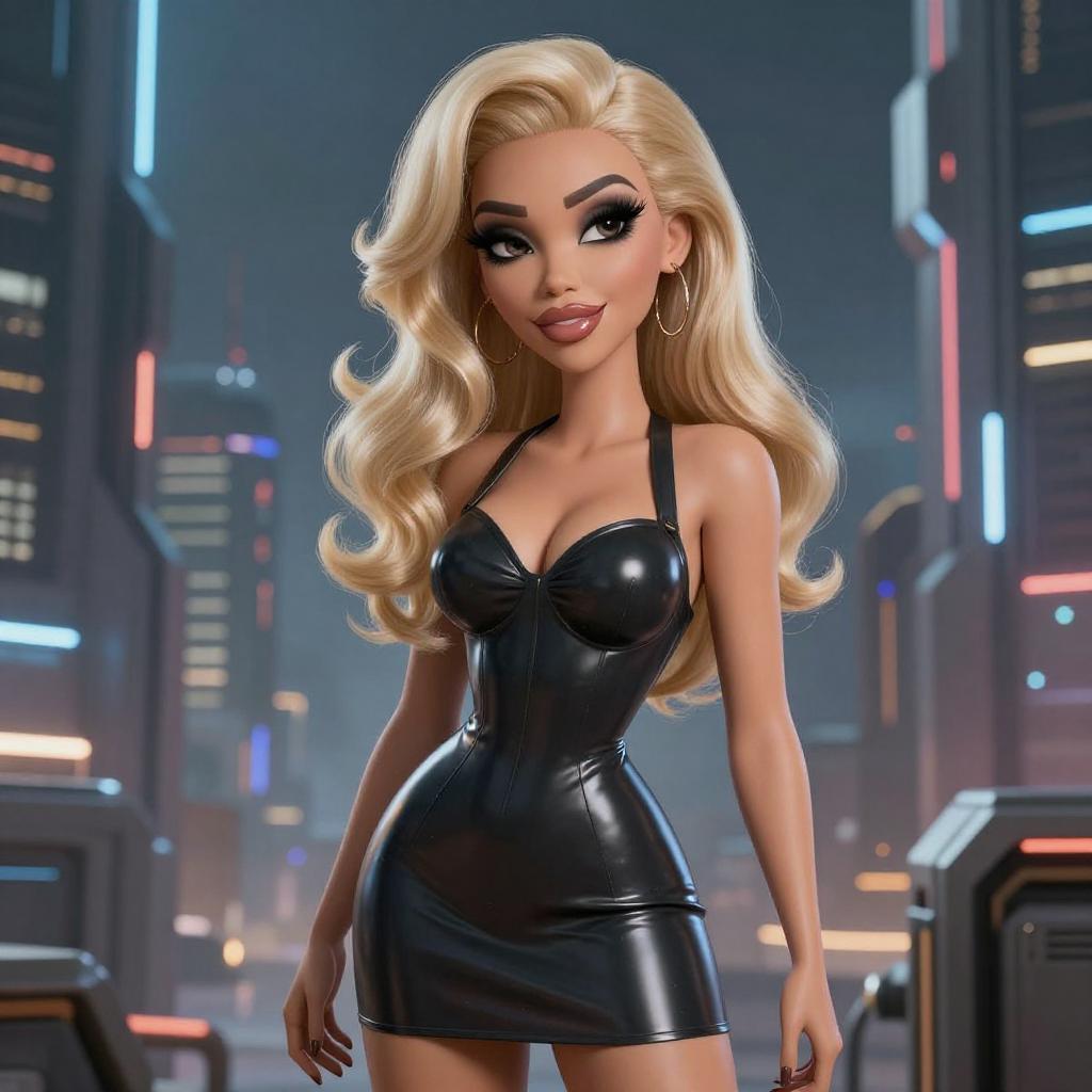 CGI image of a blonde, blue-eyed doll in a tight, black latex mini-dress with a front zipper, standing in a futuristic, neon
