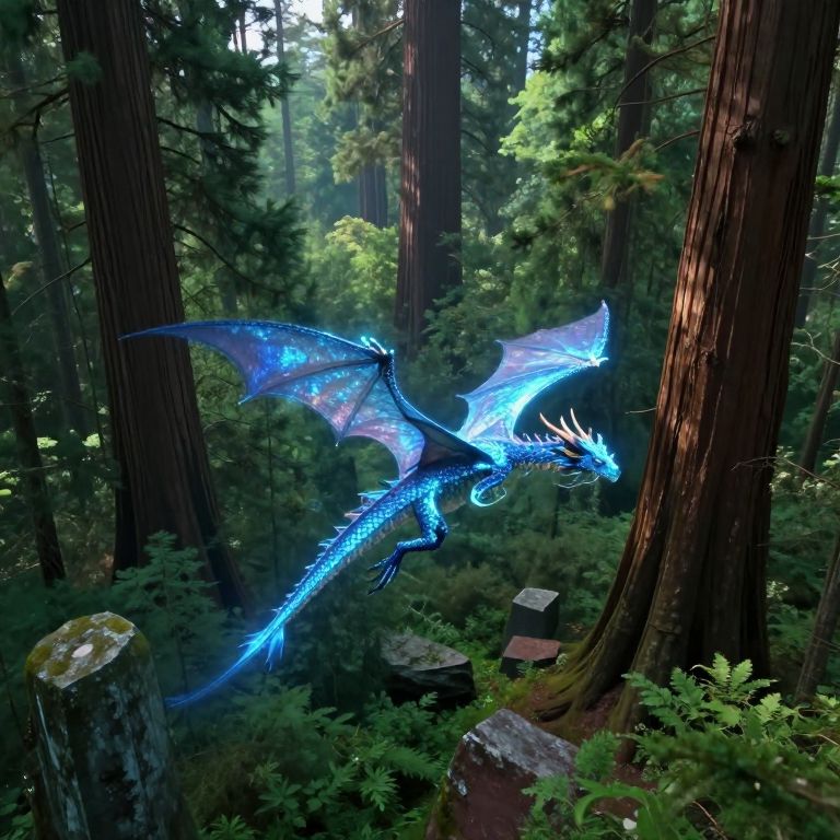 Digital artwork of a glowing blue dragon with intricate wing patterns soaring through a dense, sunlit redwood forest.