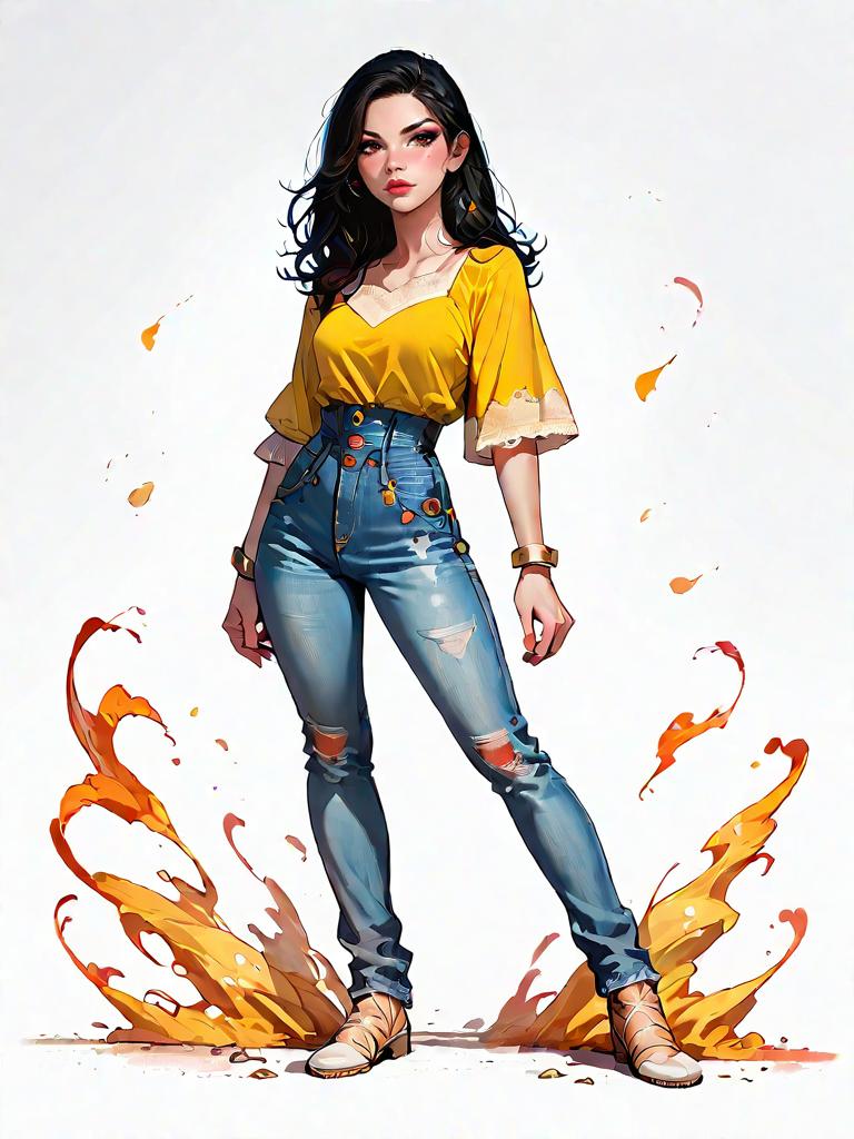 1girl, source_comics, realistic face, full body shot, Woman, casual streetwear, cropped yellow t-shirt, round neckline, short sleeves, high-waisted blue denim jeans, skinny fit, subtle whiskering, classic five-pocket design, brown belt with rectangular buckle, gold hoop earrings, side-parted hair with long braid, white studio background