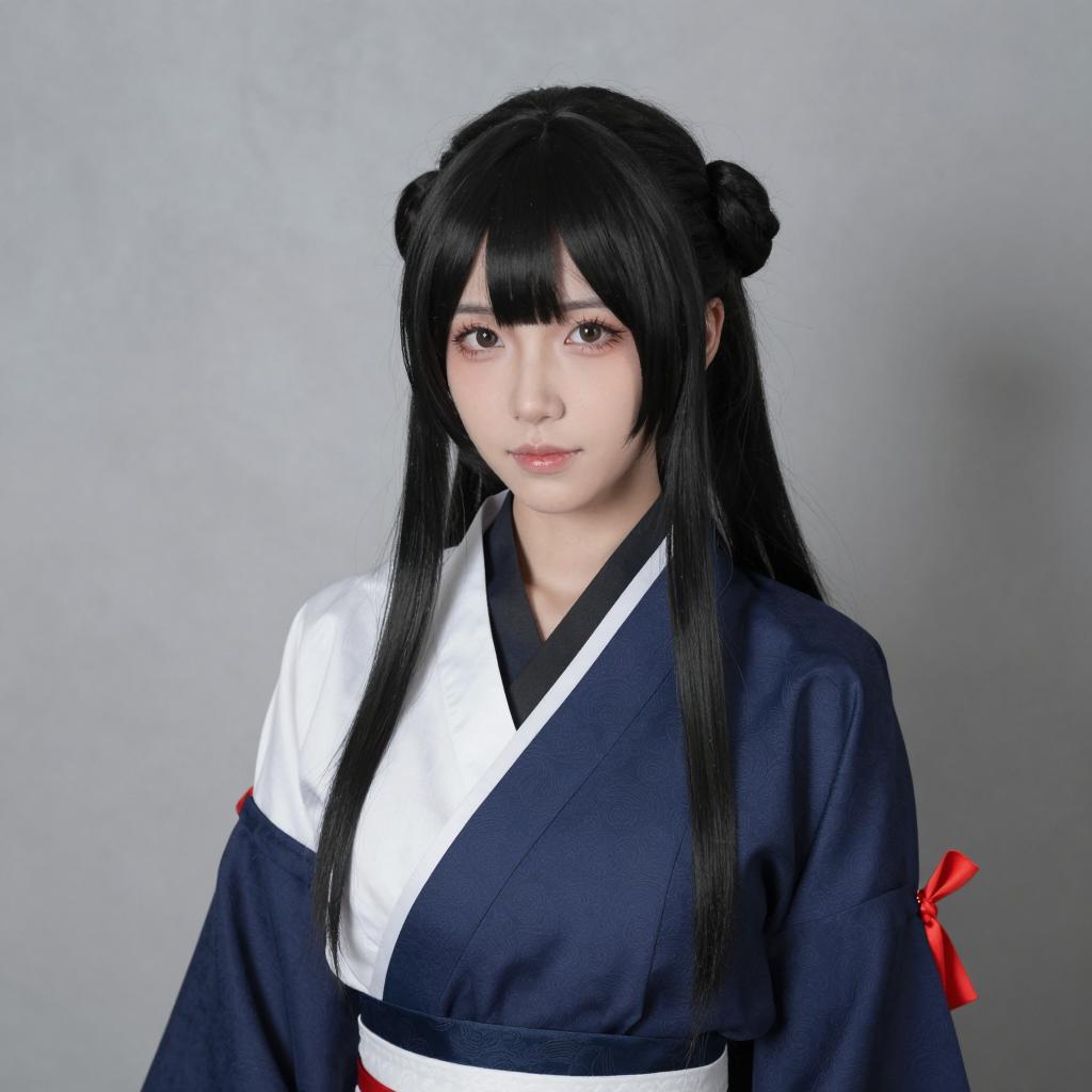 Portrait of an East Asian woman with long black hair styled with side buns, wearing a navy and white traditional Abe Takakazu cosplay costume, standing against a gray textured wall.