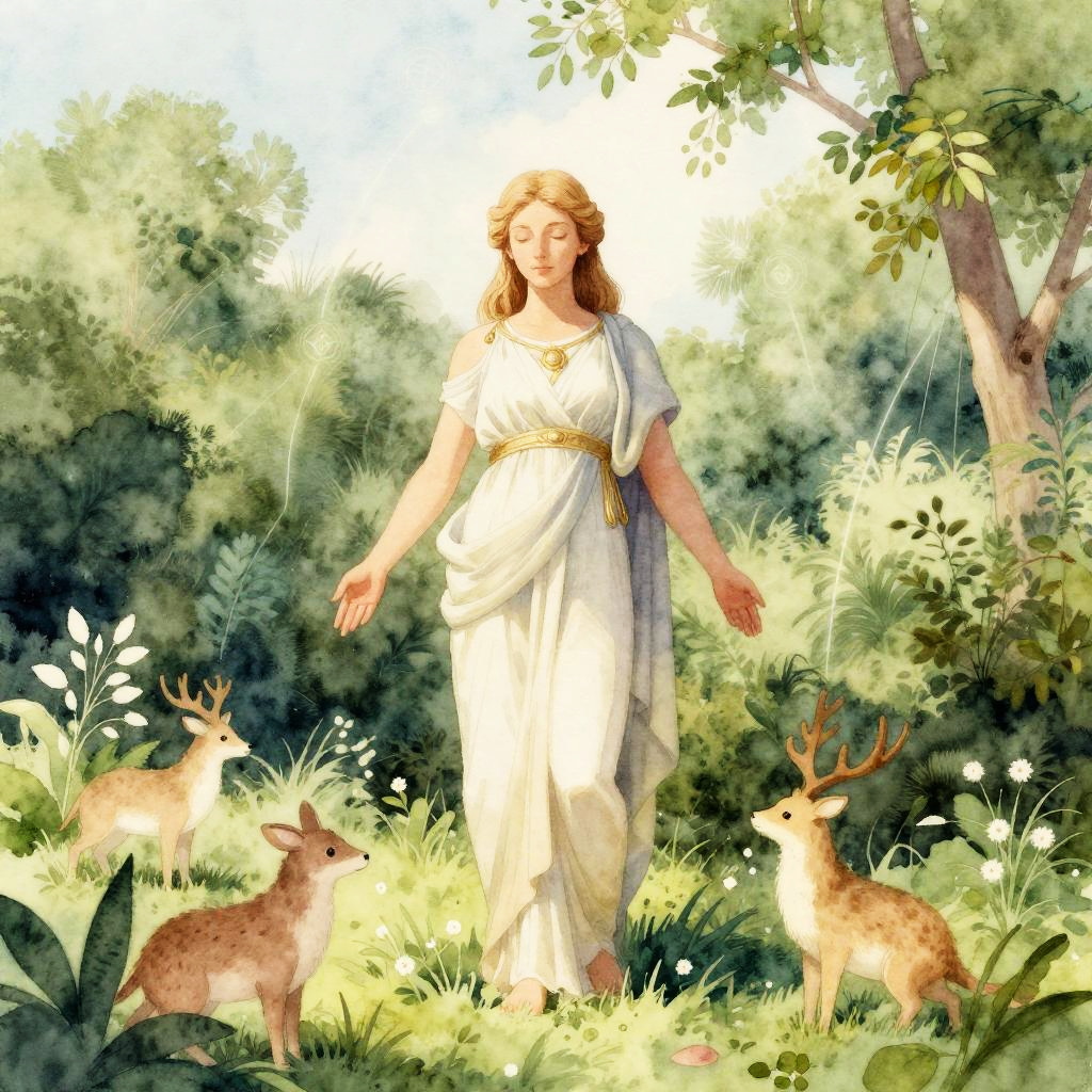 Leda as a symbol of nature’s harmony, surrounded by lush greenery and gentle wildlife, soft pastel palette, watercolor style emphasizing fluidity and softness, peaceful ambiance with subtle mythical elements like faint glowing symbols and ethereal light beams.