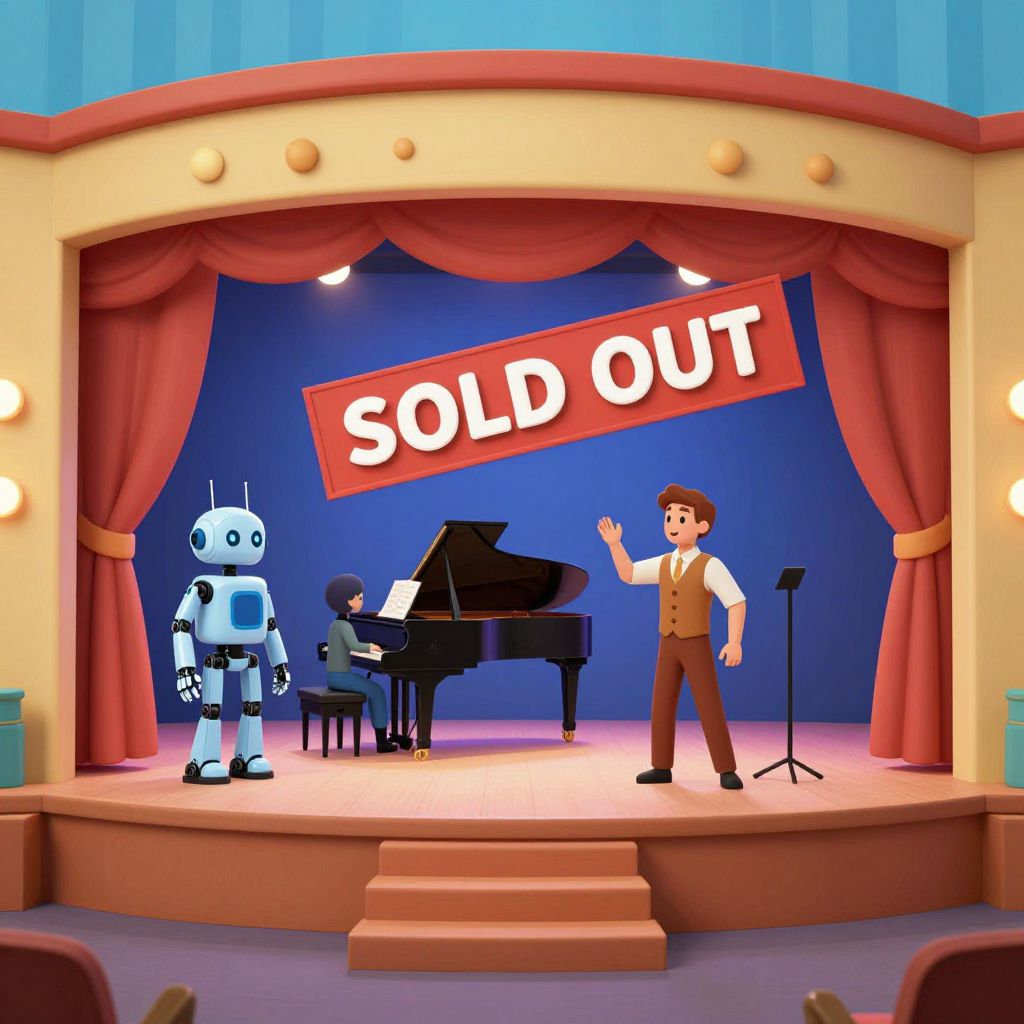 Accessory hyperrealistic lightish colourful digital art. theater stage: 1 robot and 1 pianist and 1 human actor. sold out show.,