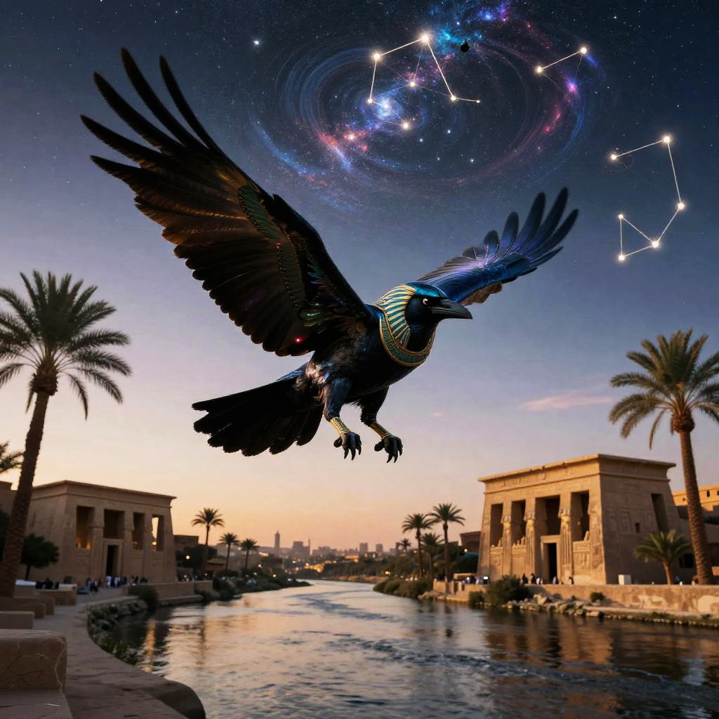 Mystical raven Egyptian god soaring over the Nile River at twilight, wings spread wide shimmering with iridescent feathers, with ancient Egyptian temples and palm trees lining the riverbanks, under a swirling cosmic sky filled with stars and constellations.
