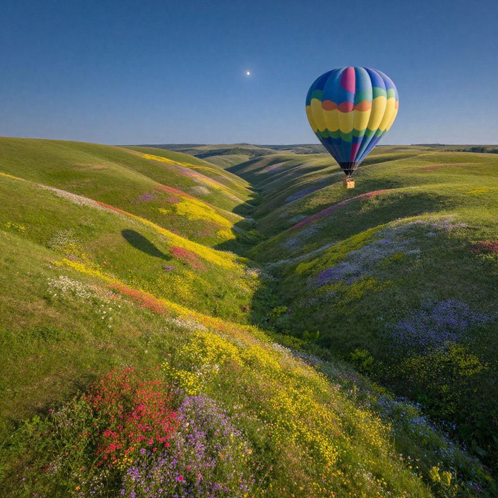 Photograph of a vibrant, rolling meadow under a clear blue sky with a single colorful hot air balloon hovering above. The meadow is a tapestry of colorful wildflowers in yellow, red, purple, and white, creating a lush, textured landscape. The hot air balloon, with stripes of blue, yellow, green, and red, is centered in the upper right, casting a slight shadow on the hills. The sun is visible as a bright white dot in the sky, adding a warm glow to the scene. The image captures the serene beauty of nature and the balloon's delicate ascent.