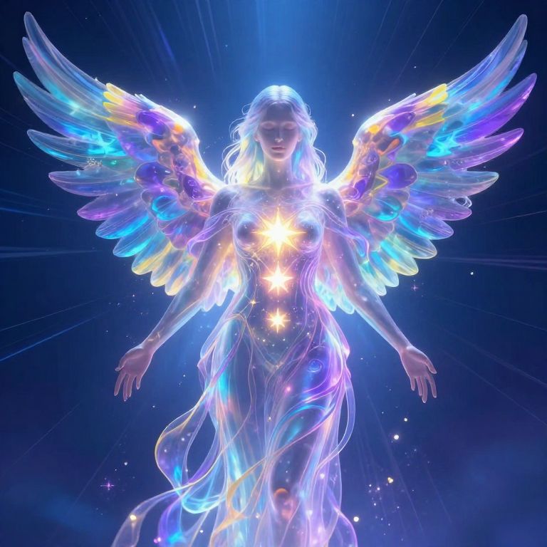 The image depicts a highly detailed, ethereal figure with a multidimensional and spiritual appearance. The figure, which appears to be a guardian angel, is adorned with vibrant, multicolored wings that seem to be made of liquid transparency, blending seamlessly with the surrounding space. The wings exhibit a spectrum of colors, including blues, purples, and yellows, creating a mesmerizing visual effect. The figure's body is transparent, allowing the viewer to see through it, adding to the sense of being in a spiritual realm. The figure's torso is adorned with a series of glowing, star-like shapes, which emit a soft, radiant light, symbolizing reiki energy or spiritual power. The background is a deep, dark blue, with streaks of light radiating outward, enhancing the sense of dimensionality and depth. The overall composition is balanced, with the figure centrally positioned, surrounded by the ethereal light and colors, creating a harmonious and spiritually uplifting scene.
