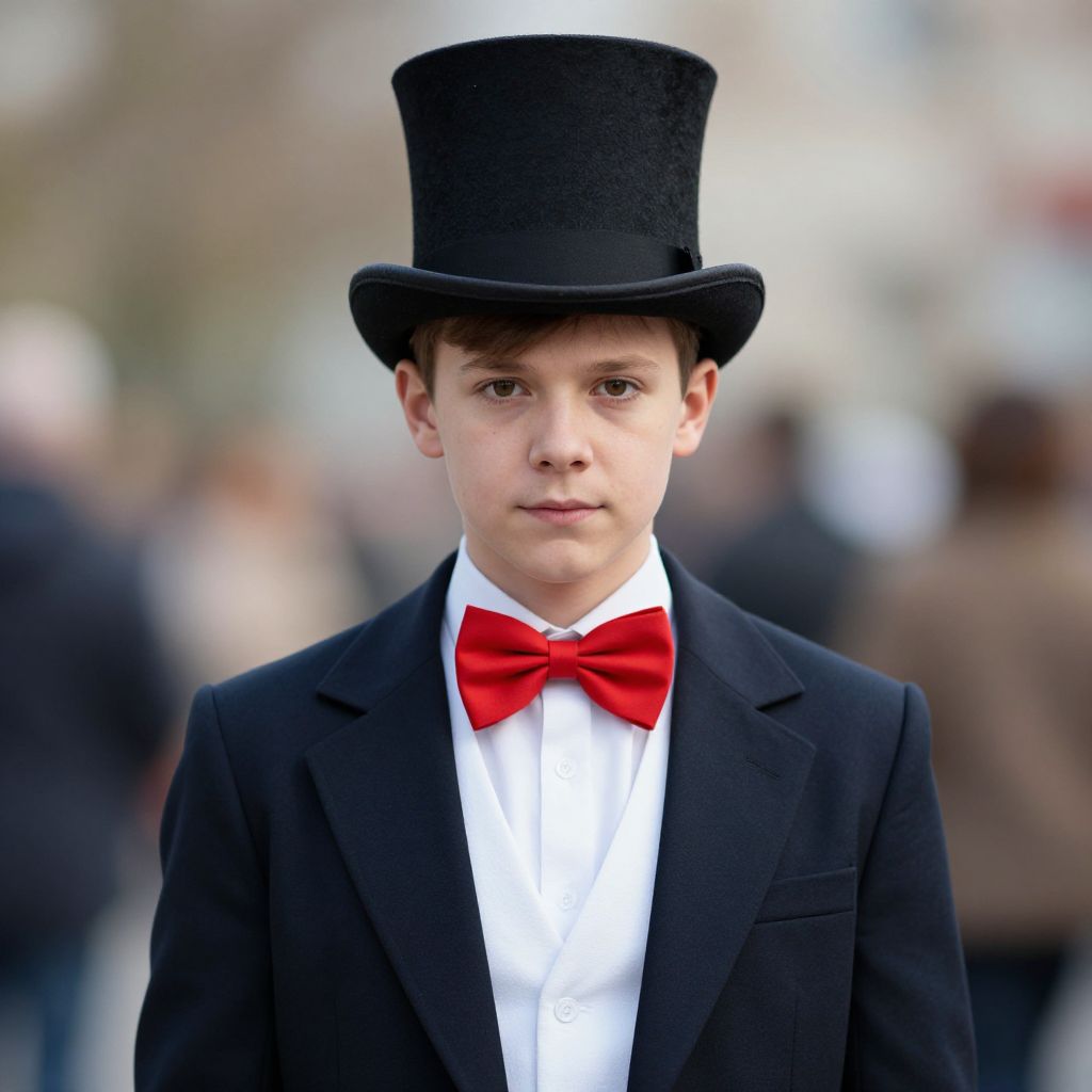 Photograph of a young boy with light skin and brown eyes, wearing a black top hat, black formal jacket, white dress shirt, and bright red bow tie. He has short brown hair and a serious expression. The background is blurred, showing indistinct figures and outdoor setting with hints of greenery and buildings. The boy stands centered, taking up most of the frame, and the image has a shallow depth of field, focusing sharply on the boy while the background remains out of focus.