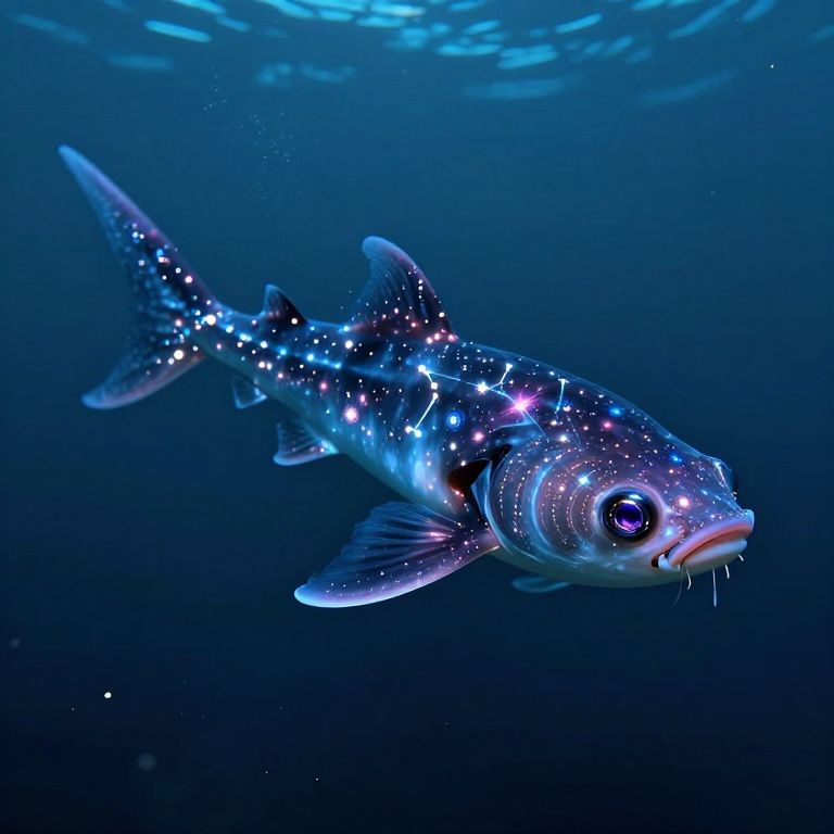 A cosmic catfish drifts through the void, its body adorned with shimmering constellations and its eyes aglow with swirling galaxies, defying the boundaries between sea and sky.