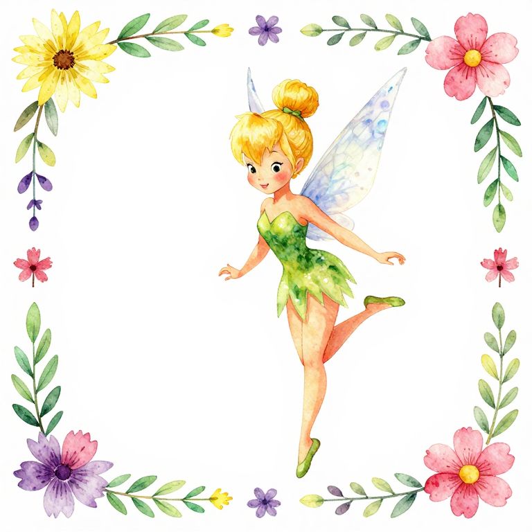 Watercolor illustration of a cheerful Tinkerbell fairy with blonde hair, green dress, and blue wings, surrounded by colorful flowers and leaves.