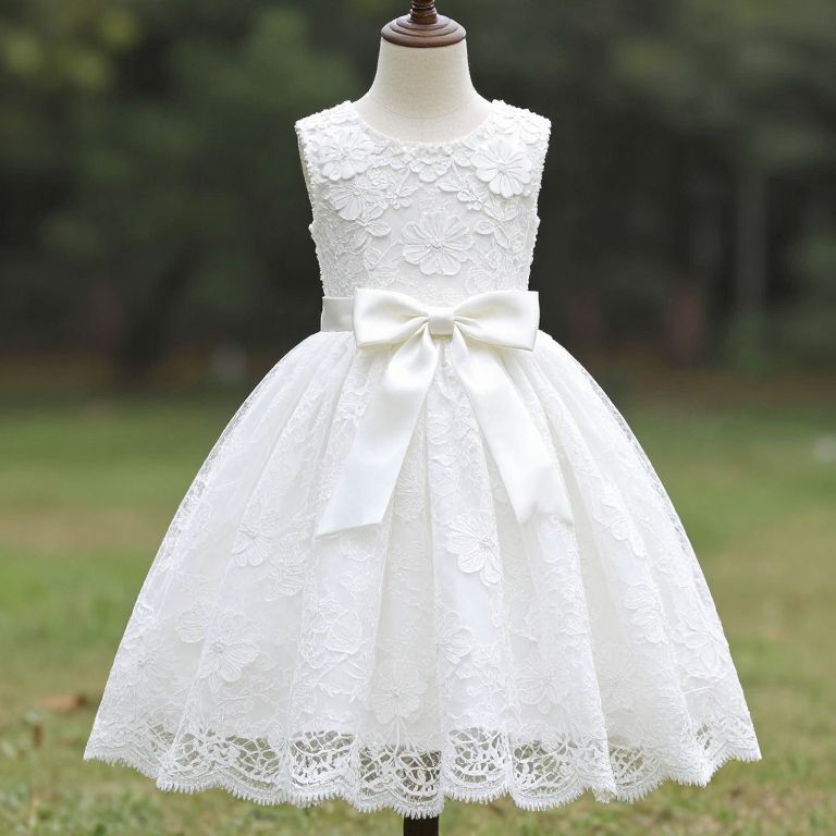 Photograph of a white lace sleeveless dress displayed on a mannequin stand. The dress has a fitted lace bodice with intricate floral patterns and a wide, elegant waistband tied into a bow. The skirt is full and flares out, adorned with delicate lace overlay that matches the bodice. The mannequin is positioned outdoors on a grassy lawn with a blurred background of dark green trees. The dress's texture appears soft and intricate, with a classic, elegant style suitable for formal occasions.